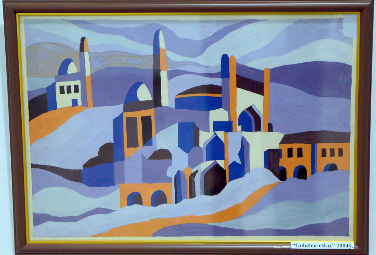 Sheker is a native of the Halach etrap of the Lebap velayat. From her childhood memories, her mother wove carpets in her spare time, while her father, an accountant by profession, loved drawing literary characters. Sheker was more inclined toward her father’s passion. At school, she was responsible for the wall newspaper, and teachers turned only to her for all design work. However, when the time came to choose a specialty upon entering the Turkmen State Art School, Sheker selected the carpet department. Her teacher, Anna Yomudovna Atayeva, could not have been prouder of her student, who, in addition to her studies, regularly visited the Ashgabat Carpet Factory. The teacher advised the diligent student to continue her education at the Academy of Arts, and Sheker followed her advice. At the Academy, her instructor Amanmyrat Atayev immediately noticed in the first-year student a unique ability not to repeat traditional carpet ornaments but to create new ones. He created all the necessary conditions to develop these abilities.