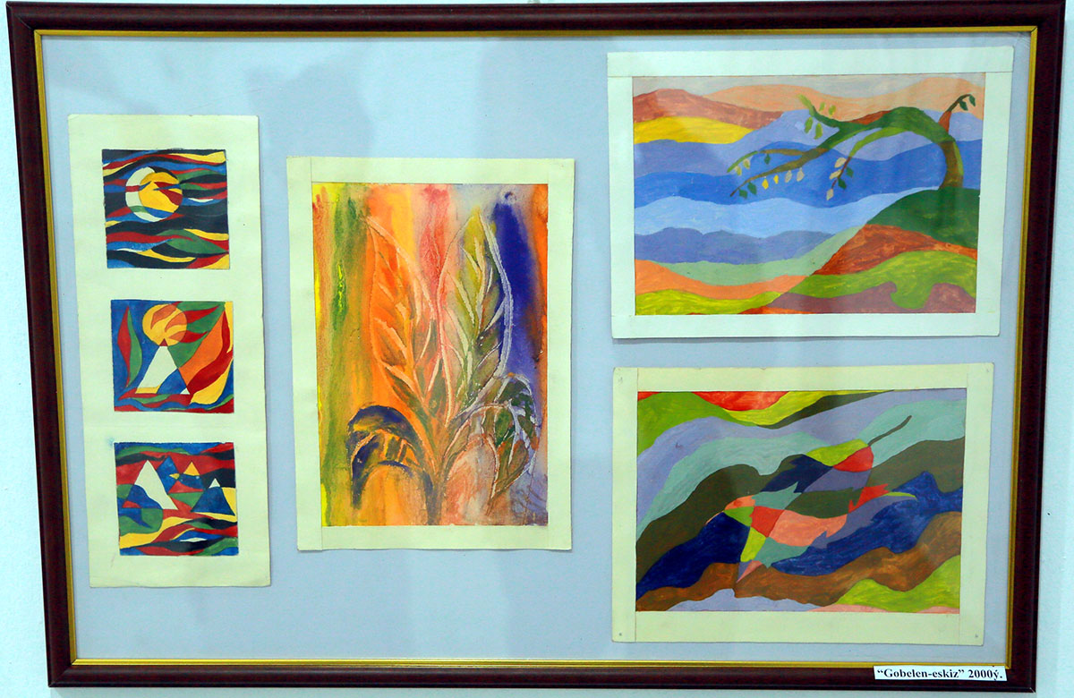 The anniversary exhibition of Sheker Hudayberenova’s works clearly demonstrated the artist’s ability to transform everything she sees into her own carpet ornaments and to skillfully vary color palettes. Sheker Shayarovna presented numerous sketches from which carpets and tapestries have already been woven, as well as designs patiently awaiting their time. Among the sketches, the work “XXI – Altyn Asyr” stands out. Sheker depicted the Monument of Independence of Turkmenistan within a circle, and for the background chose the Roman numeral XXI, placing it in a rectangle and arranging multiple such rectangles into a creative ornament.