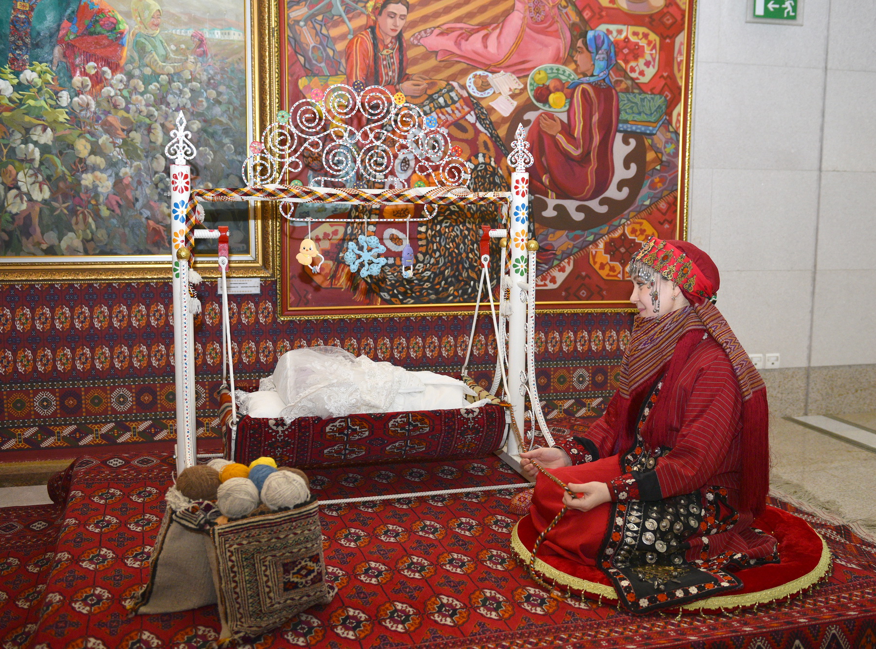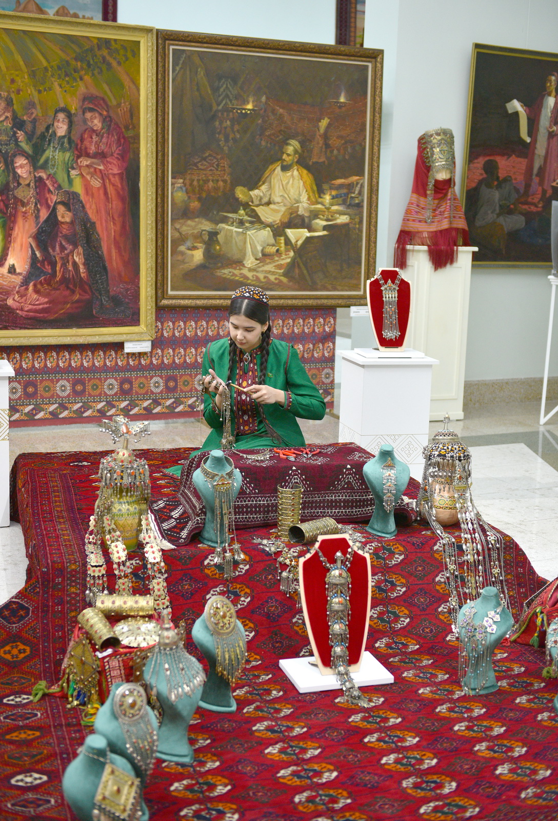 The exhibition of carpets, carpet products, and tapestries by Bahar Pirgulyyeva was accompanied by the singing of a female bakhshi. Meanwhile, during the presentation of Turkmen jewelry works, a student of Ayjemal Saryeva continued working on her own piece.