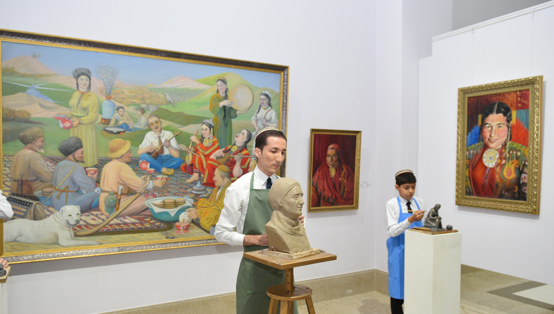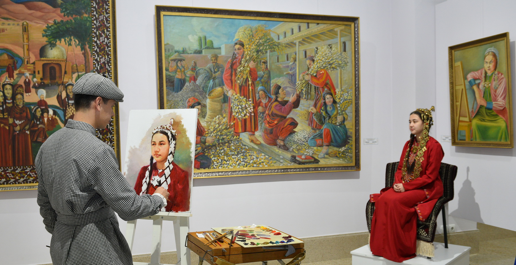 This was the first surprise, while the visitors were soon to encounter a second, even more unexpected one. In one of the halls, the Shock Movement School of Arts of the East came to life with its legendary student, the first professional Turkmen artist Byashim Nuraly. A student of the State Academy of Arts of Turkmenistan, Jumamurat Gurbanov, dressed in a checkered suit identical to the one in the famous photograph of the artist, performed the role of Byashim Nuraly. A painting master class was held surrounded by the artist’s well-known paintings. Meanwhile, under the paintings of Olga Mizgiryova and Sergey Beglyarov—other students of the school—master classes in sculpture and ceramics were conducted.