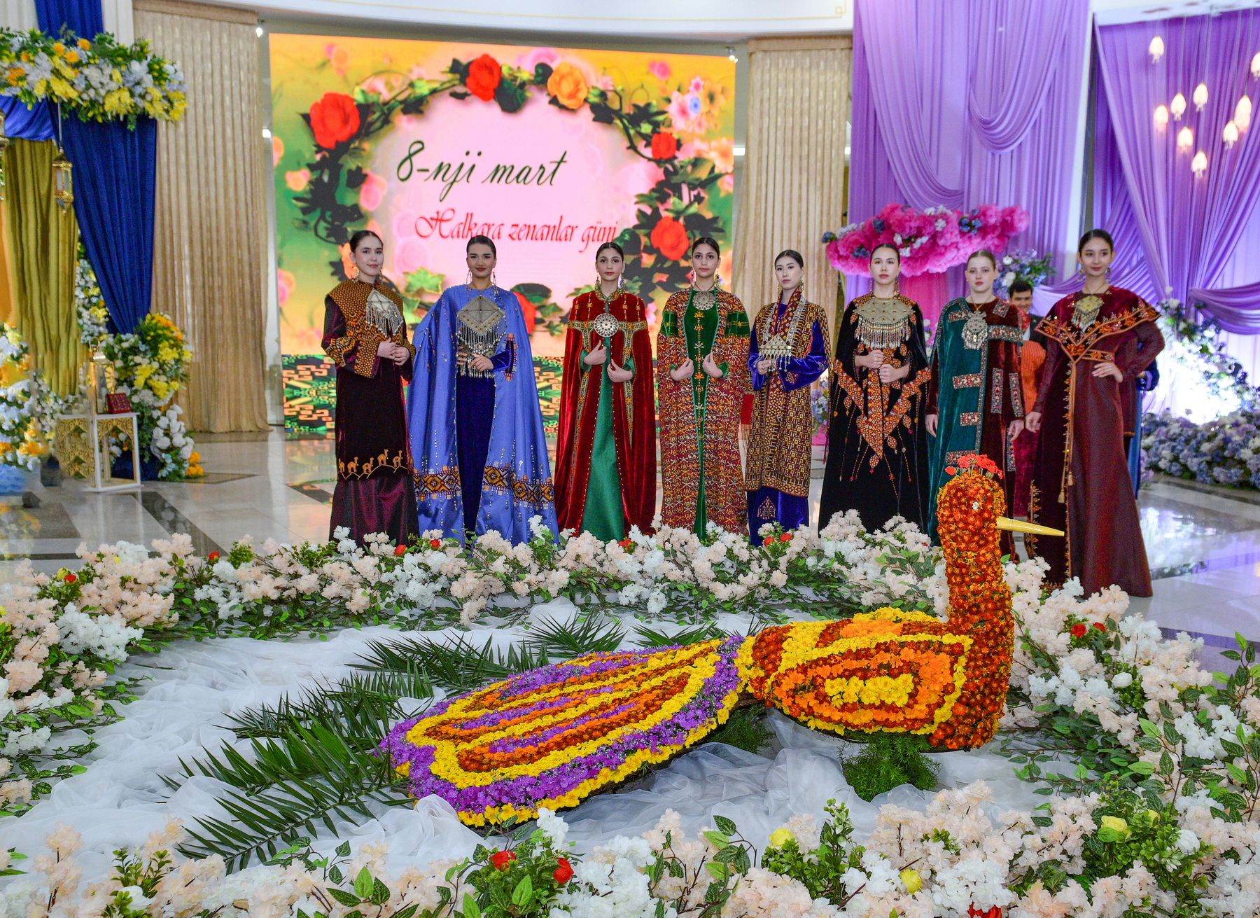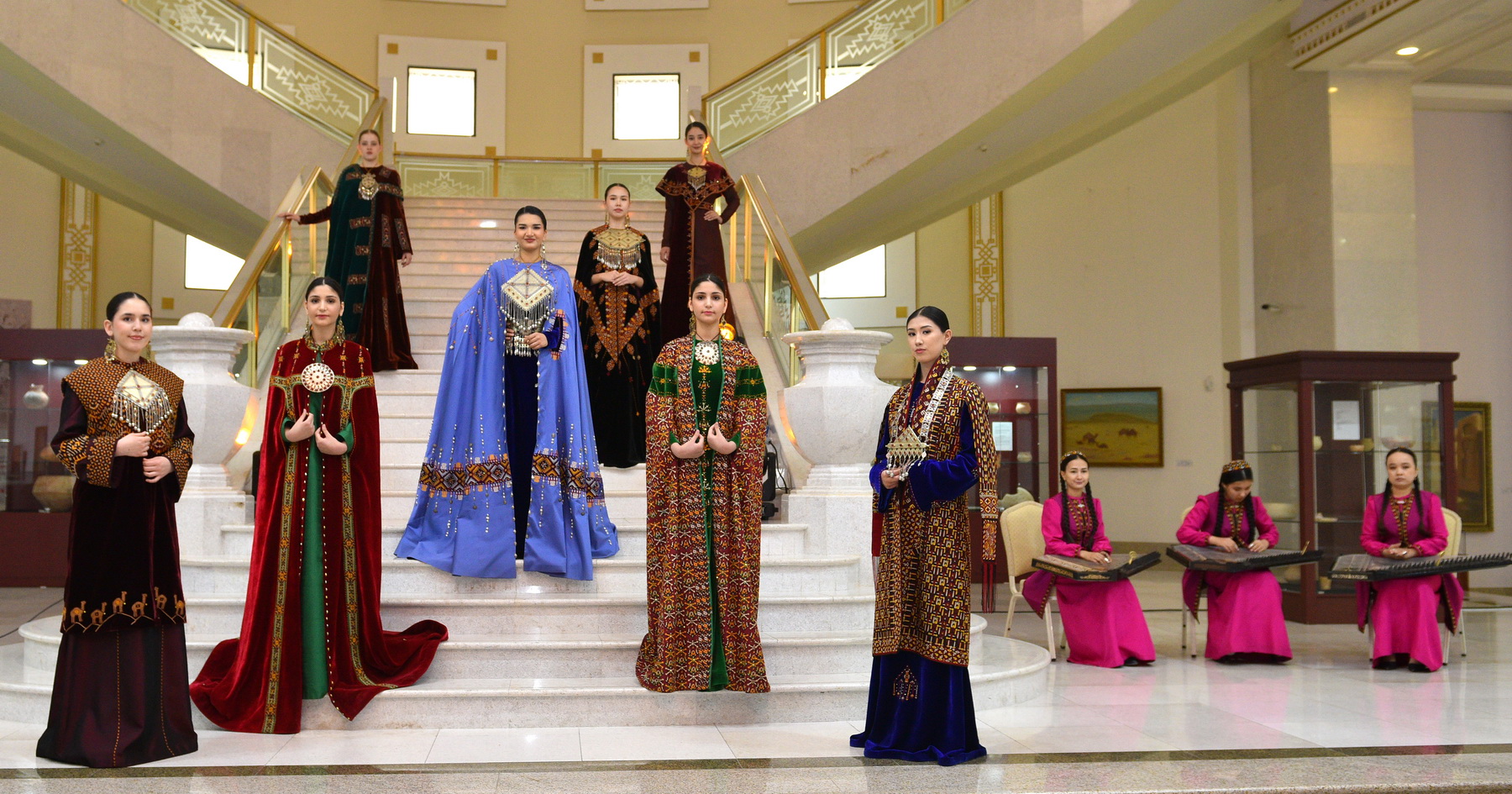 The atrium hall, where visitors first entered the museum, was filled with compositions of fresh and artificial flowers, creating a festive atmosphere of spring and beauty. In one of the exhibition halls, music performed on ancient musical instruments could be heard. Eight young women—symbolizing March 8—gracefully descended the staircase from the second floor of the museum, dressed in beautiful Turkmen national costumes while presenting a collection of fashionable clothing.