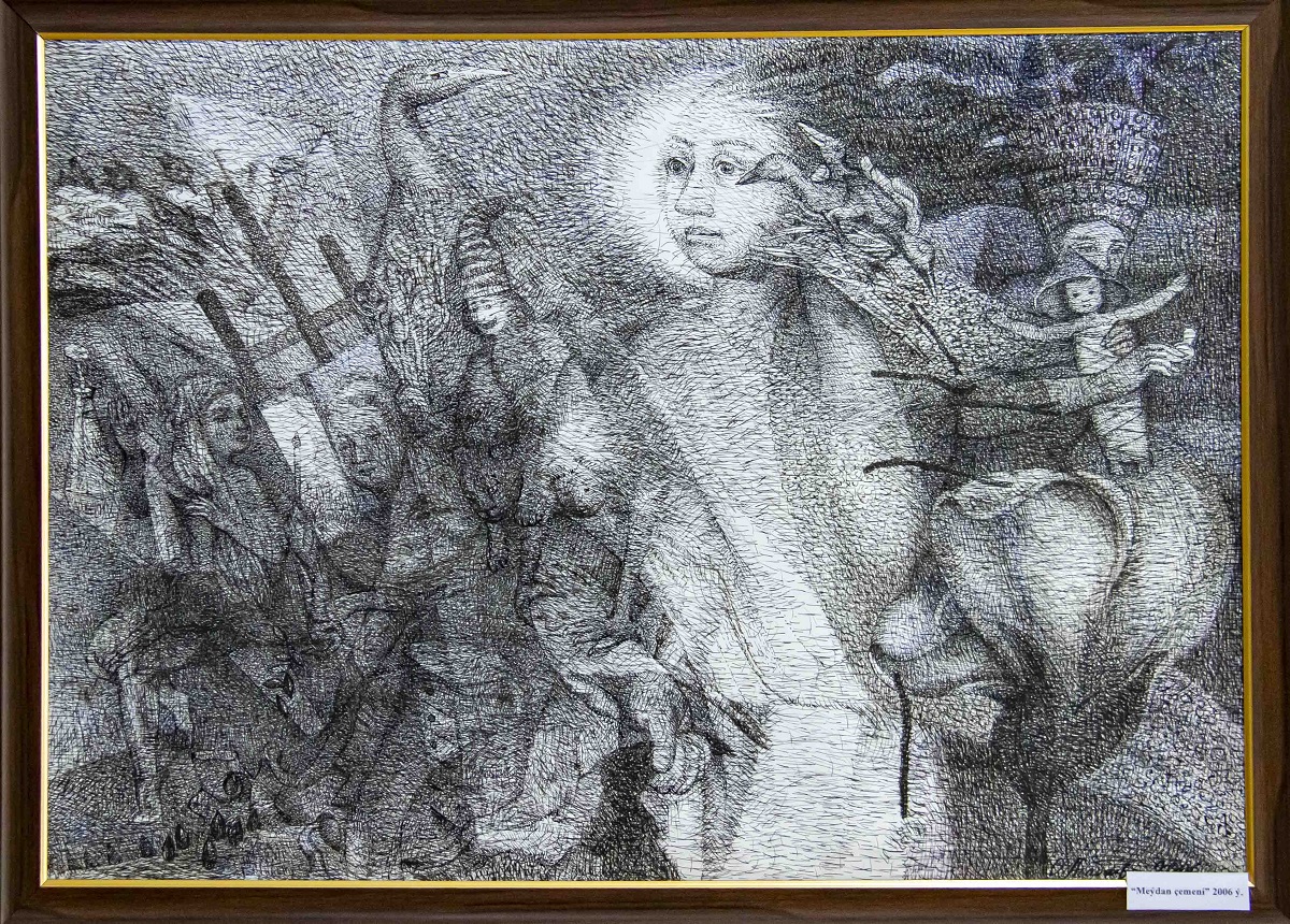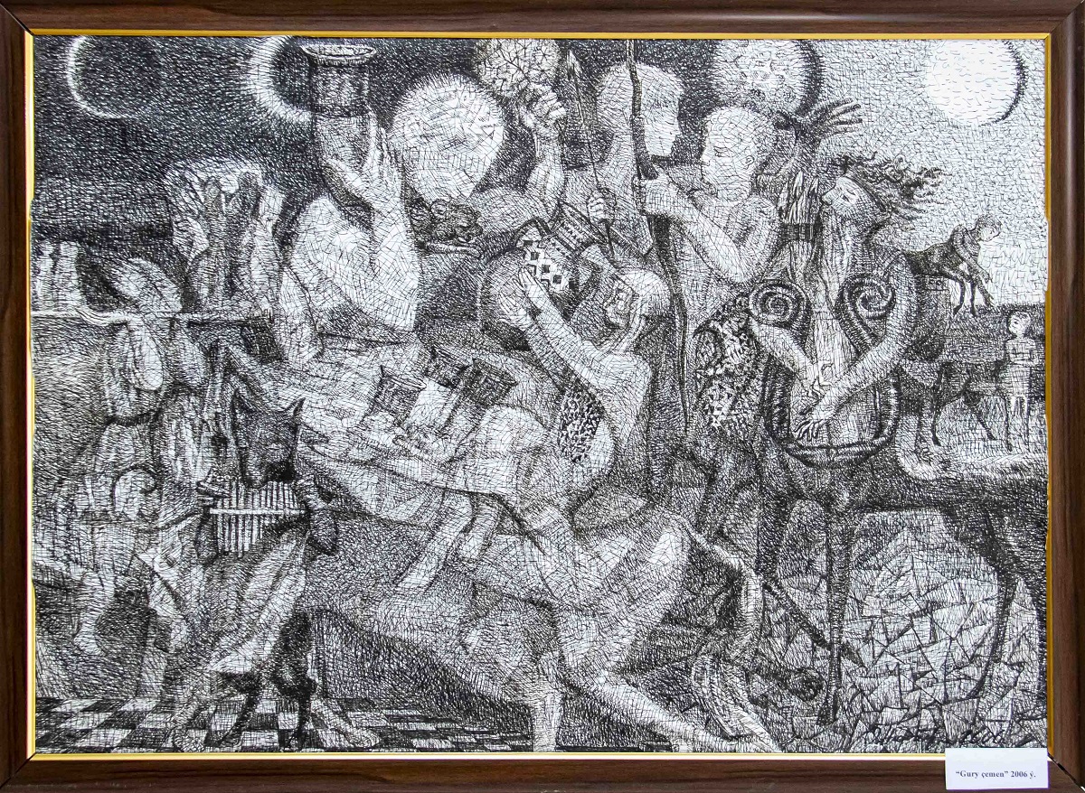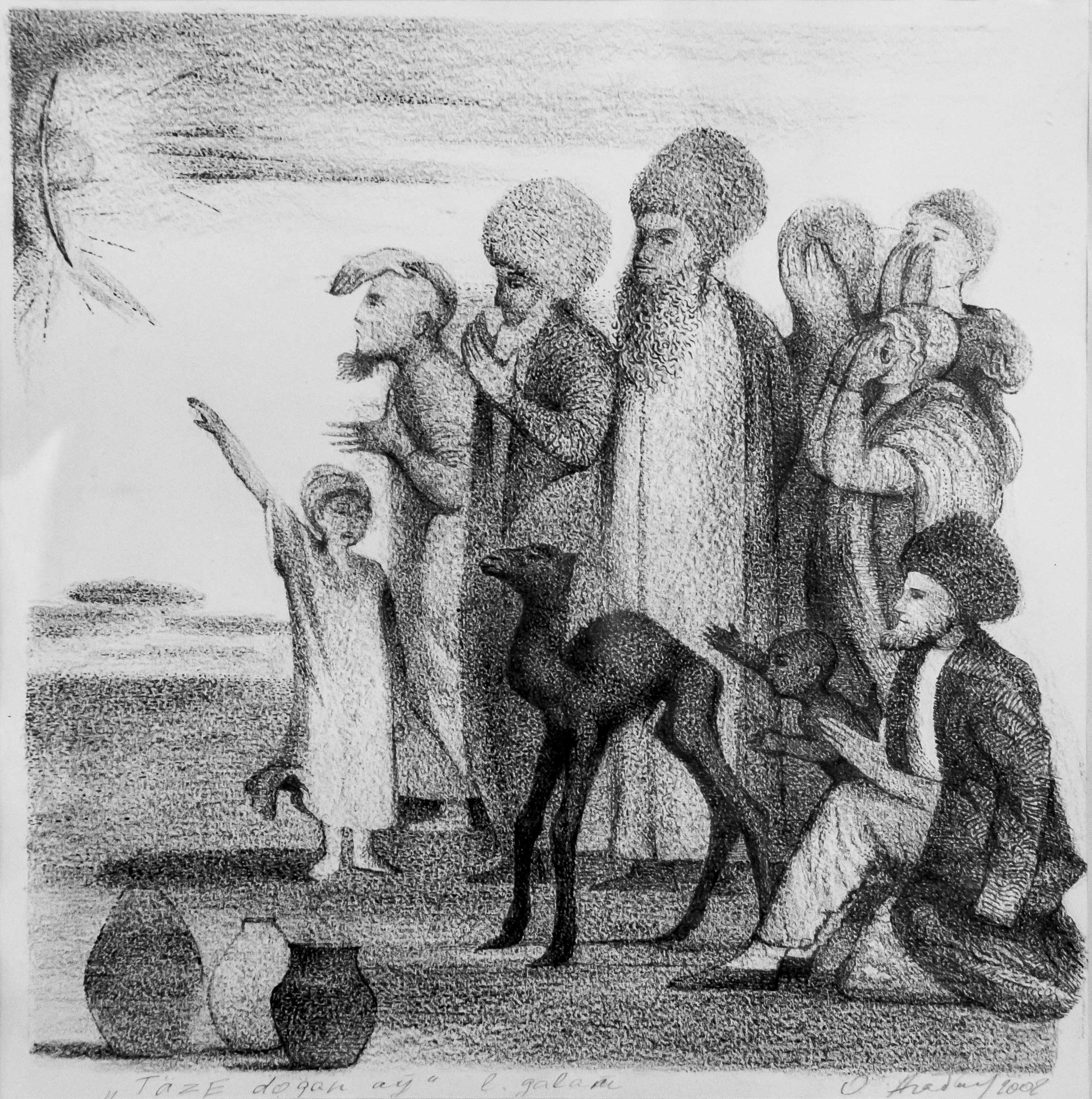After graduating in 1976 from the Turkmen State Art School, Oraz Agabayev illustrated a children’s book about shepherds. This work so captivated the artist that it became a defining moment in his creative life. Thus, a distinctive graphic artist emerged in the country, whose works differ markedly from those of other painters. Feeling an irresistible attraction to this form of visual art, Agabayev continued his studies at the Faculty of Graphics of the Ukrainian Polygraphic Institute named after Ivan Fedorov. During his studies, he mastered all types of graphic art: drawing, pencil, charcoal, printmaking, xylography, and lithography. He mastered everything related to graphic art. Yet an artist is also a philosopher, with a personal worldview, a broad knowledge base, and the ability to vividly express ideas born in the soul.