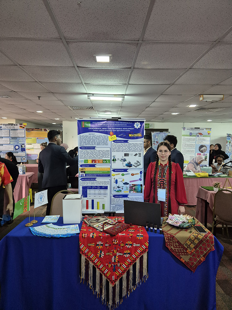 The scientific project "Production of carbon dioxide-trapping sorbent from agricultural waste", carried out by Tumar Orpaeva, a 3rd-year student at the University, under the guidance of senior lecturer Saparmurat Ovezsakhedov, was highly appreciated by the jury. Having presented this scientific project, Tumar received a gold medal in the direction of the environmental science competition. In her work, she presented a method for producing a highly porous sorbent from agricultural waste such as rice husks, cotton stalks, remnants of grapes and fruits mulberry tree, as well as scientifically proven its effectiveness in absorbing carbon dioxide.