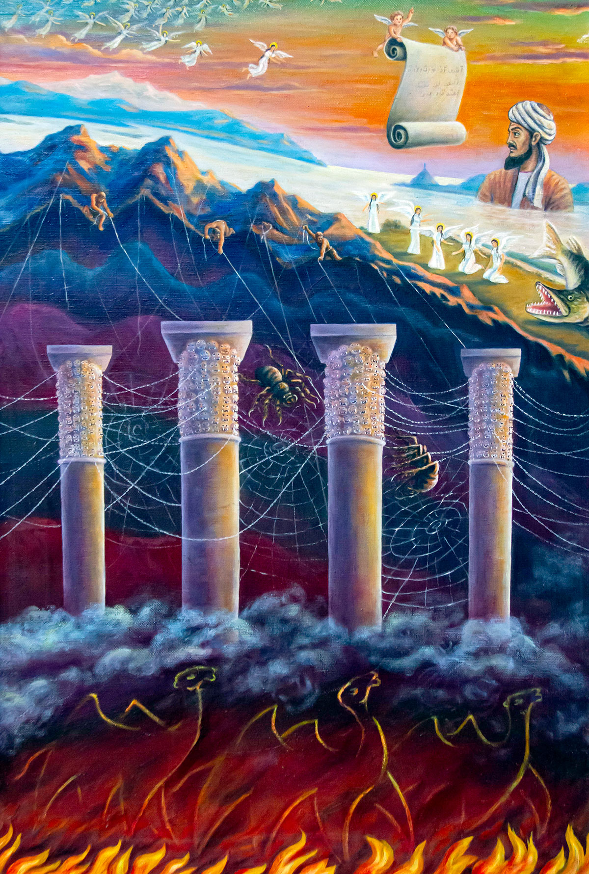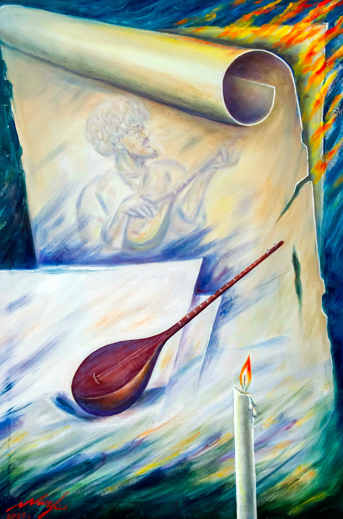 A significant place in the exhibition is occupied by paintings from the cycle «The World of Magtymguly's Poetry». As a rule, the works from this cycle are made in realistic or symbolic genres. The author introduced visitors to paintings from the cycle «The World of Leonardo da Vinci», where the artist most often depicted Mona Lisa (Gioconda). The painting «The Da Vinci Code» shows the gaze of a metaphysical creature turned to a ball symbolising infinity. In the background, Leonardo da Vinci himself is closely watching the creature from the drapery of the blanket.