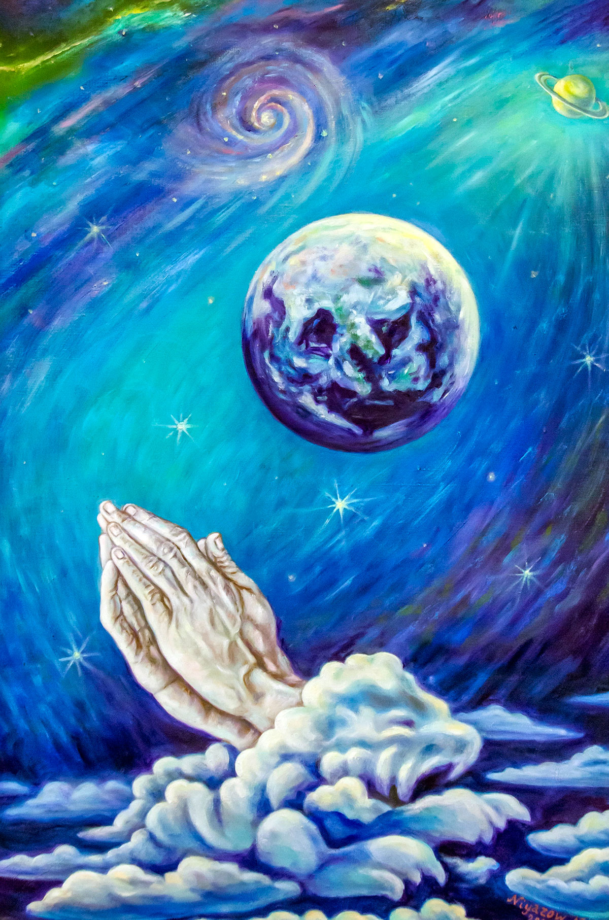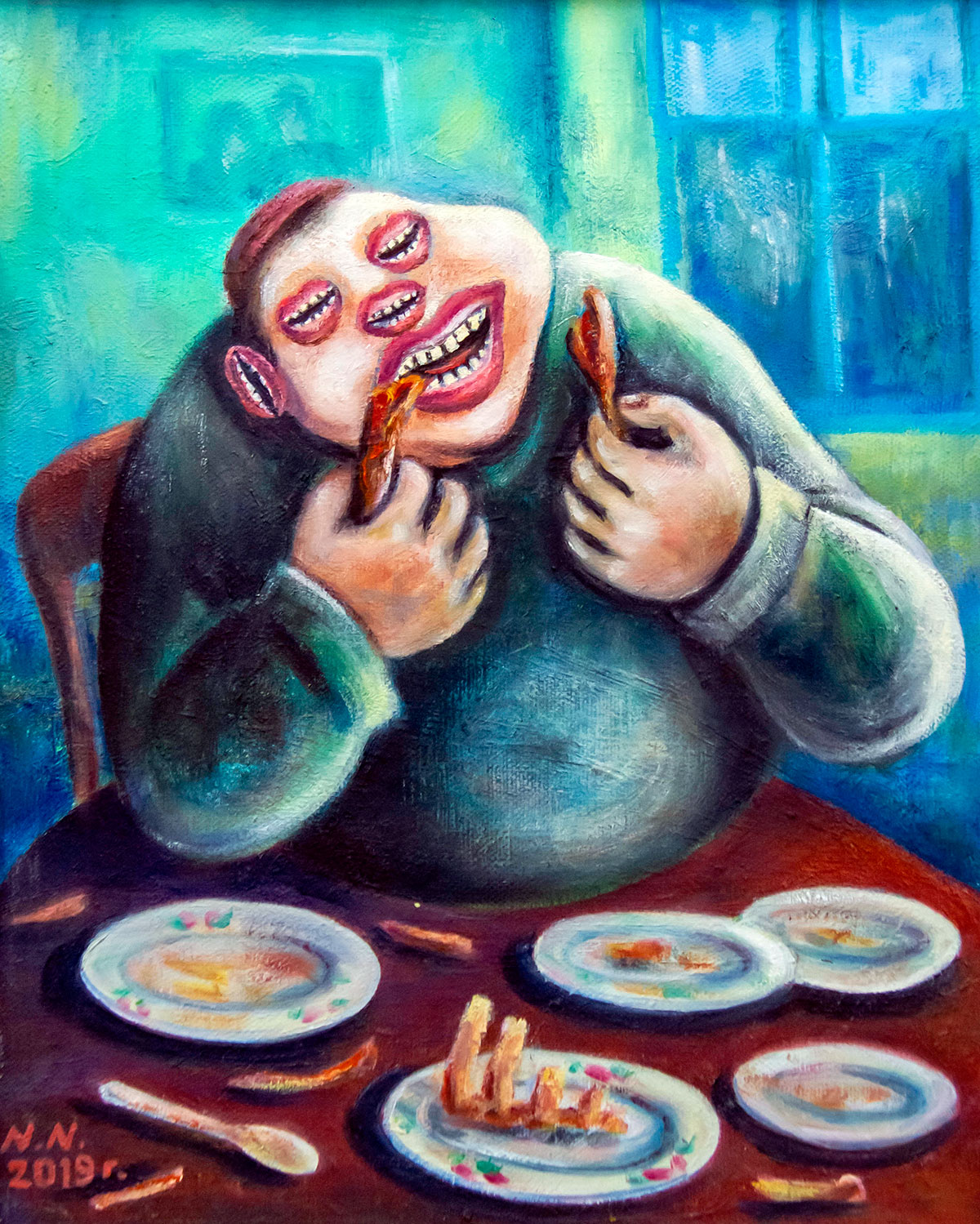 This time, the main painting at the exhibition was the work «Metaphysical Hand Reaching Out to Other Planets». Painted in the style of Salvador Dali, the painting conceals many mysteries. On the hand stretched out to infinity is a watch without a dial, which indicates the absence of time, next to the watch are galloping horsemen, as well as a knight chess piece. In the distance, on a small island of land, there is a lighthouse. If you look closely, you can see the silhouettes of Adam and Eve in the outlines of the lighthouse. And instead of a head, the metaphysical man has a planet similar to the Moon. Perhaps the author wanted to say that man is a part of nature and is interconnected with it. But man is very ambitious and stretches out his hands where he is not asked. And the slightest deviation from the Earth's trajectory can bring another planet down on his head. Perhaps the author has a more optimistic interpretation.