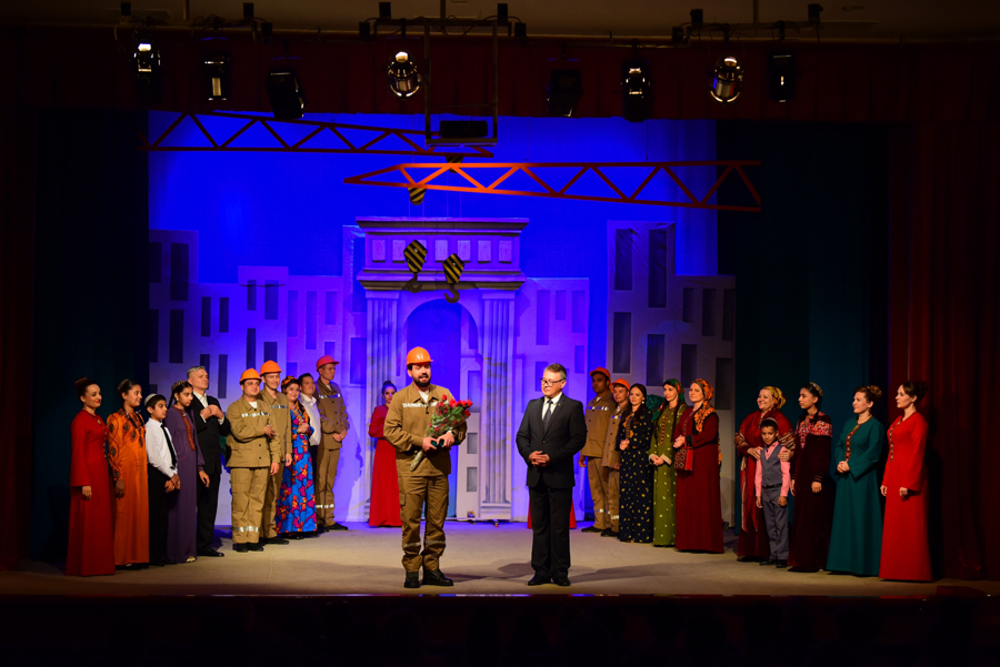 Set designer Vepa Annaberdiyev achieved great results. He was especially successful with the first scene depicting a construction site: cranes lifting heavy loads, workers focused on carrying construction materials – the atmosphere of a tense work moment is felt on stage.