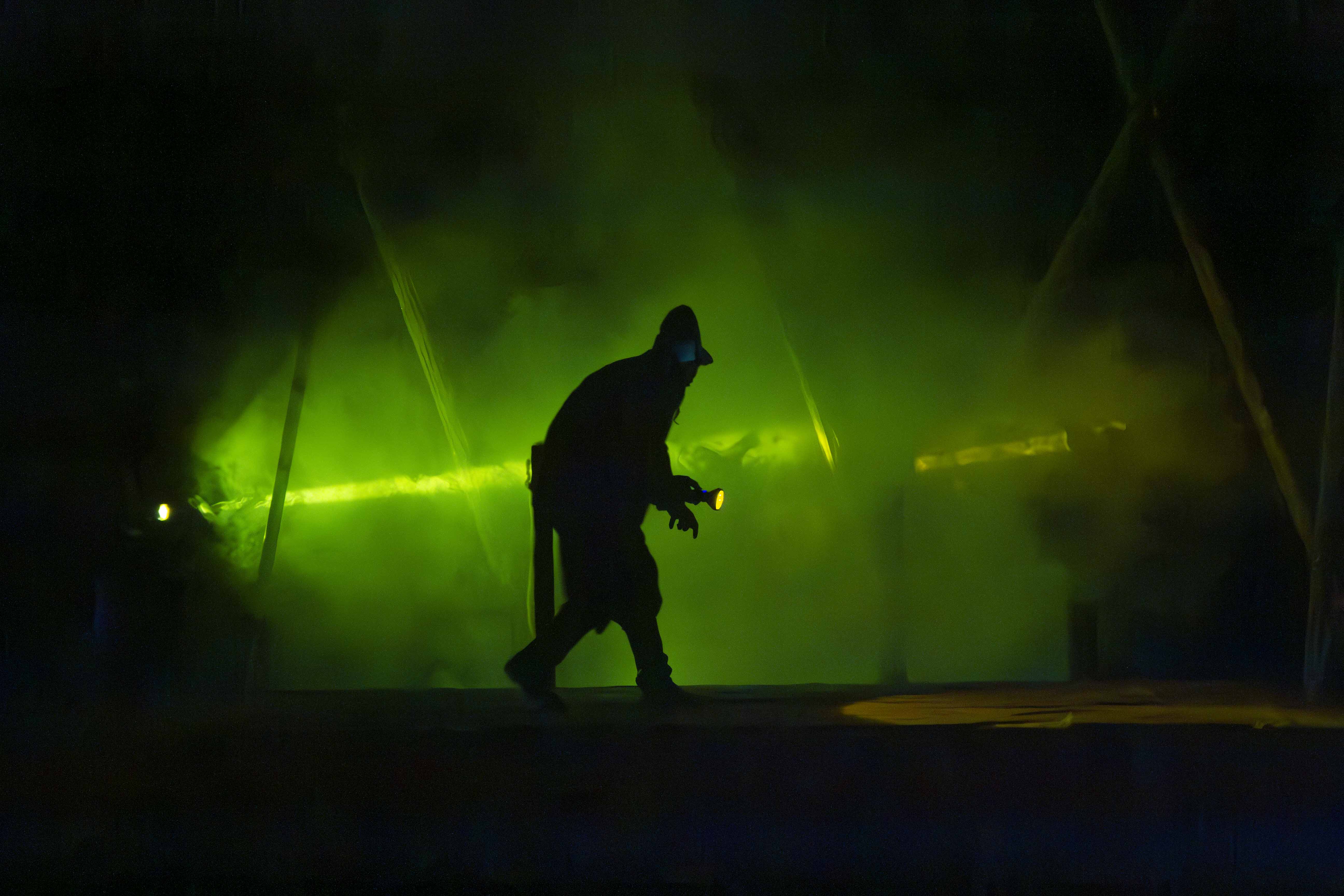 The set designer Mekan Annamyradov outdid himself while working on the scenography. A ravine overgrown with reeds in the foreground brings us close to Kyrgyz nature. A long wooden bridge spanning the entire stage, dimly lit by street lamps, is the road to the border outpost. The presentation of Seide's room in her house and the village council office—where Seide was summoned by a policeman for interrogation—is interestingly done by just one wall with an entrance door, outlining the entire setting.