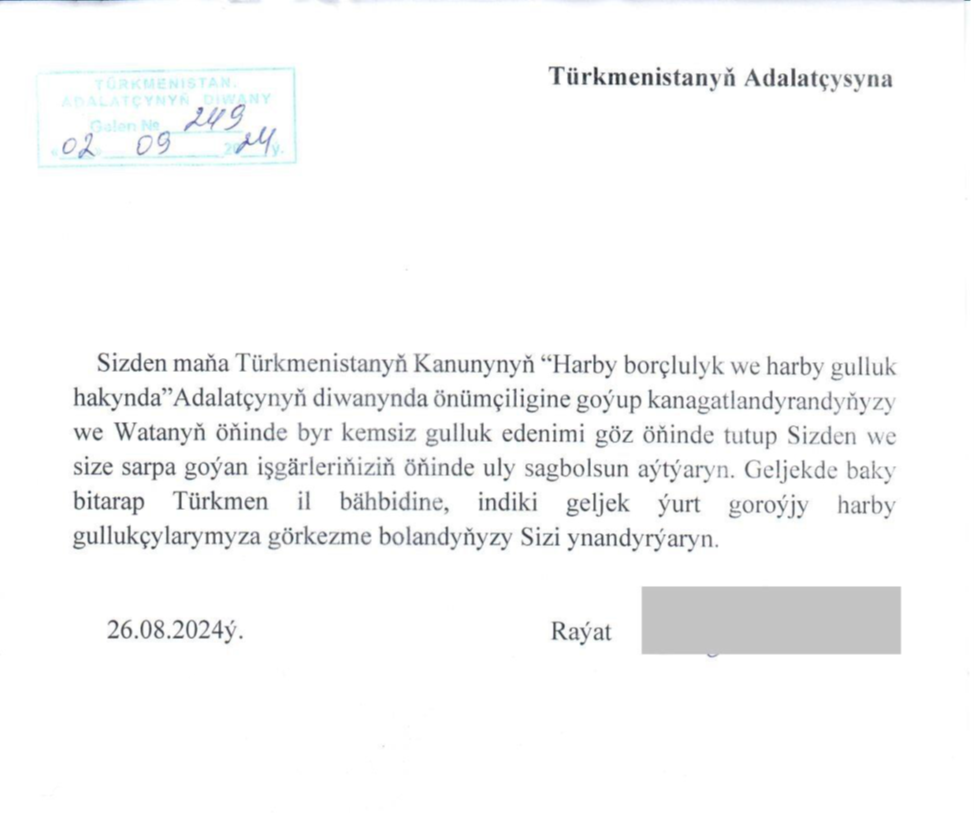 I express my gratitude to you and the employees of your Office for satisfying my request in accordance with the Law of Turkmenistan “On Military Duty and Military Service”.