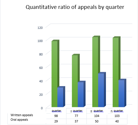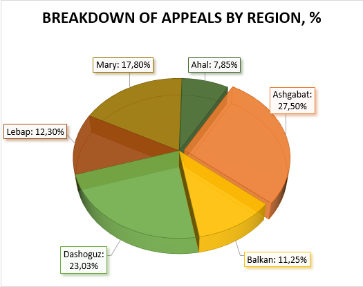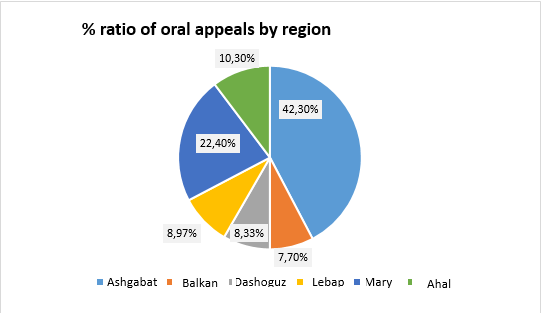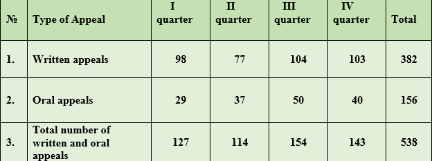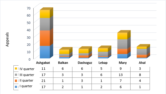 Concurrently, the study of acts of State authorities and local self-governments, including enterprises, institutions and organizations, regardless of the form of ownership affecting human rights and freedoms, as well as appeals filed in the Office of the Ombudsman on this issue, created the opportunity to evaluate and study the degree of ensuring and observing human rights and freedoms. All oral and written appeals received in the Ombudsman’s Office during the year under review were considered in accordance with the Law of Turkmenistan “On the Ombudsman” and relevant decisions were made on them.