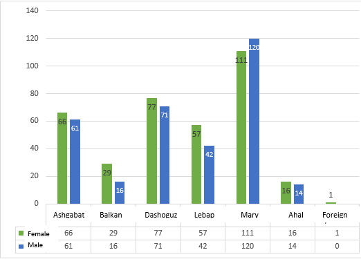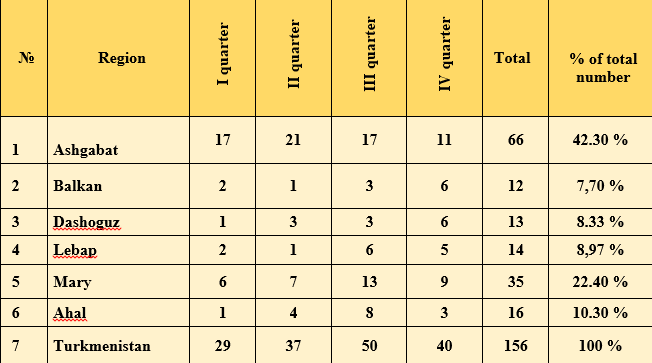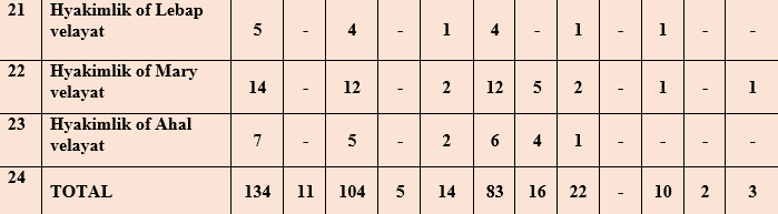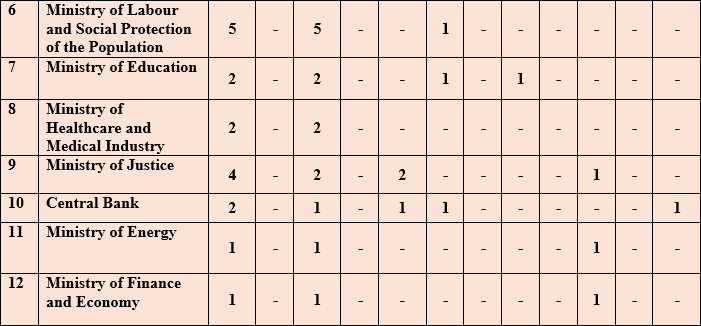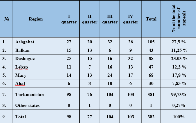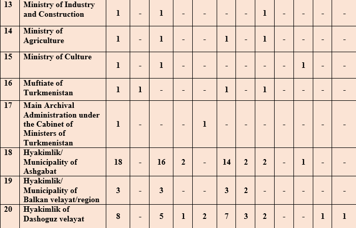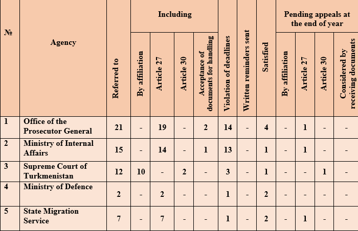 In this chapter of the Report, the issues of the Ombudsman’s inquiries within the limits of her powers will be touched upon in accordance with Article 27 of the Law of Turkmenistan “On the Ombudsman” to authorized state bodies and local self-government bodies, relevant officials of assistance in carrying out inspections of complaints and applications accepted by citizens, the Ombudsman’s appeals to institutions, enterprises and organizations, or to their officials for the immediate restoration of the violated human and civil rights and freedoms confirmed on the basis of Article 30 of the Law, appeals to the relevant authorities for the provision of necessary documents on the basis of paragraph 2, first part of Article 18 of the Law and related complaints and appeals of citizens, and other cases of the Ombudsman’s appeal to the relevant authorities, not related to with complaints from citizens.