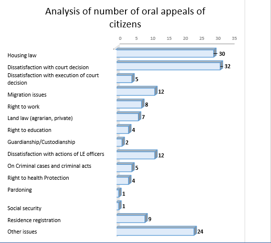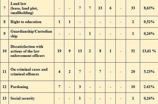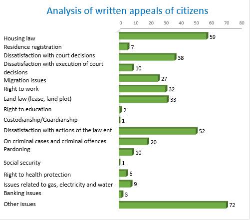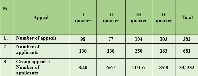 Thus, in this chapter, devoted to the appeals and proposals of the Ombudsman implemented in the year under review, the work carried out is shown on the basis of the above examples. However, despite the fact that positive results have been achieved on some of the issues raised, it remains necessary to draw the attention of officials and authorized bodies to violations of laws taking place.