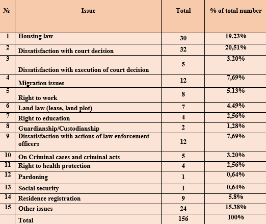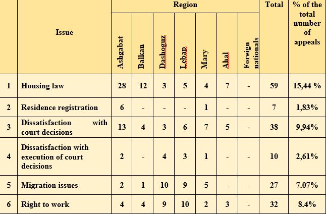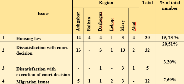 In 2024, the Office of the Ombudsman received 89 appeals on housing issues, of which 59 were written and 30 were oral. Of the submitted written appeals, 1 was satisfied. As a result of the work carried out on citizens’ appeals related to housing issues, they were given satisfactory answers in accordance with the legislation of Turkmenistan, including with the Housing Code, which is described in detail in Chapter IV of the Report.
