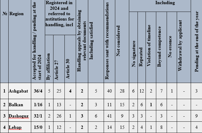 Among the objectives outlined in the Strategic Plan of the Office of the Ombudsman of Turkmenistan for 2024-2028 was the improvement of procedures for filing complaints of human rights violations by increasing the number of appeals and improving their submission methods.