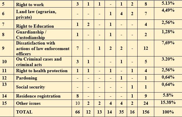 The issues of ensuring the civil and political, economic, social and cultural human, civil rights, and freedoms in the country, and activities carried out in connection with appeals to the Ombudsman, are covered in detail in the corresponding Chapter of the Report.
