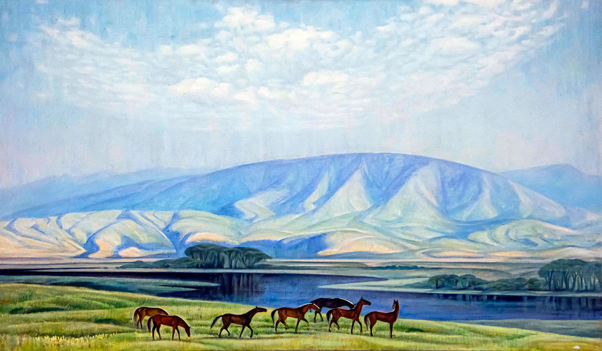 Один из учеников – художник Аманмухаммет Атабаллыев представил на выставку больших размеров картину «Кони на водопое». Работа выполнена в монохромной палитре, подчеркивая изящество ахалтекинских коней. Стиль реализма усиливает красоту этих созданий и чистоту воды, к которой они прикасаются. Эта работа надолго задерживает посетителей возле себя.