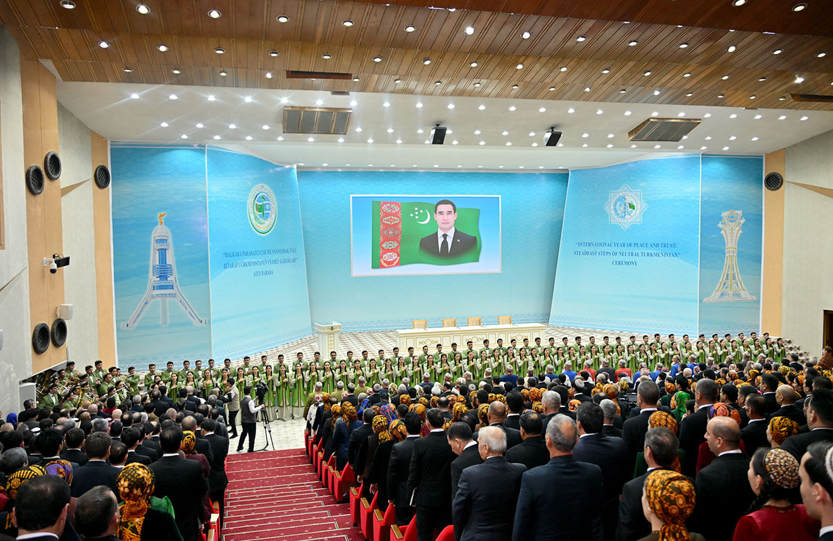 Сегодня в столичном Дворце «Mekan» состоялась торжественная церемония «Международный год мира и доверия: уверенные шаги нейтрального Туркменистана», организованная Халк Маслахаты Туркменистана. В мероприятии приняли участие члены Правительства, руководители и представители дипломатической службы нашей страны, дипломатических представительств зарубежных государств и международных организаций, аккредитованных в Туркменистане, граждане, работающие в различных сферах и секторах, а также молодёжь.