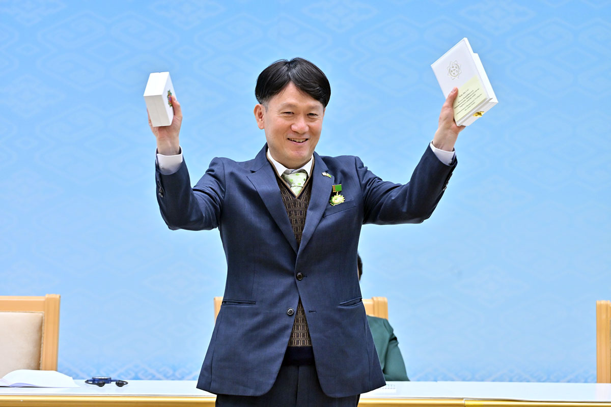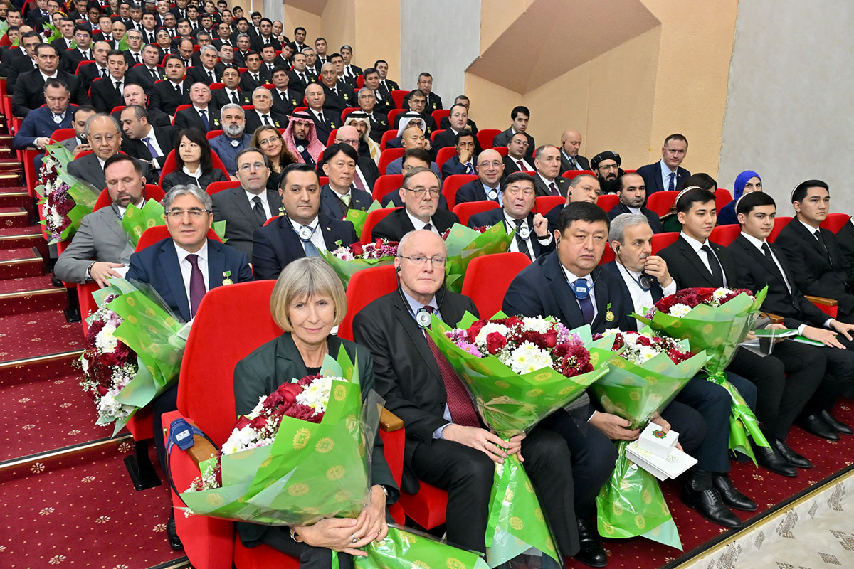 Затем состоялась церемония награждения глав дипломатических представительств иностранных государств и международных организаций, аккредитованных в Туркменистане, а также граждан нашей страны юбилейной медалью Туркменистана «Türkmenistanyň Bitaraplygynyň 30 ýyllygyna» и памятным серебряным знаком.