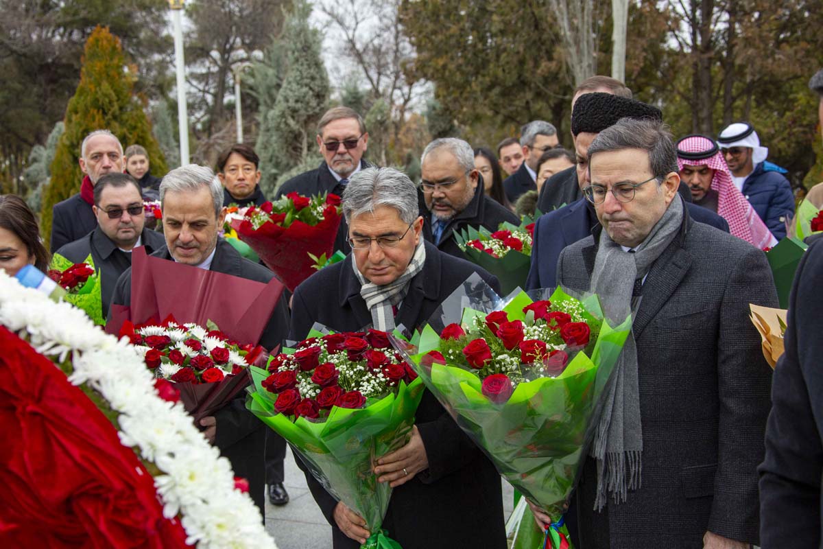 Мероприятие, организованное в честь 585-летия со дня рождения великого классика, собрало представителей дипломатических миссий. Участники церемонии возложили символичные венки и букеты цветов к подножию монумента.
