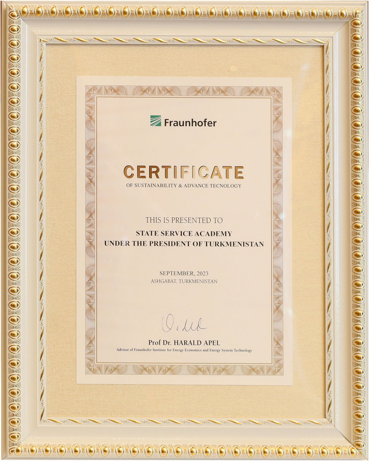 Затем советник Института экономики энергетики и технологии энергетических систем имени Фраунгофера (ФРГ) профессор д-р Харальд Апель под аплодисменты присутствующих вручил ректору Академии Сертификат данного Института за внедрение устойчивых и передовых технологий.