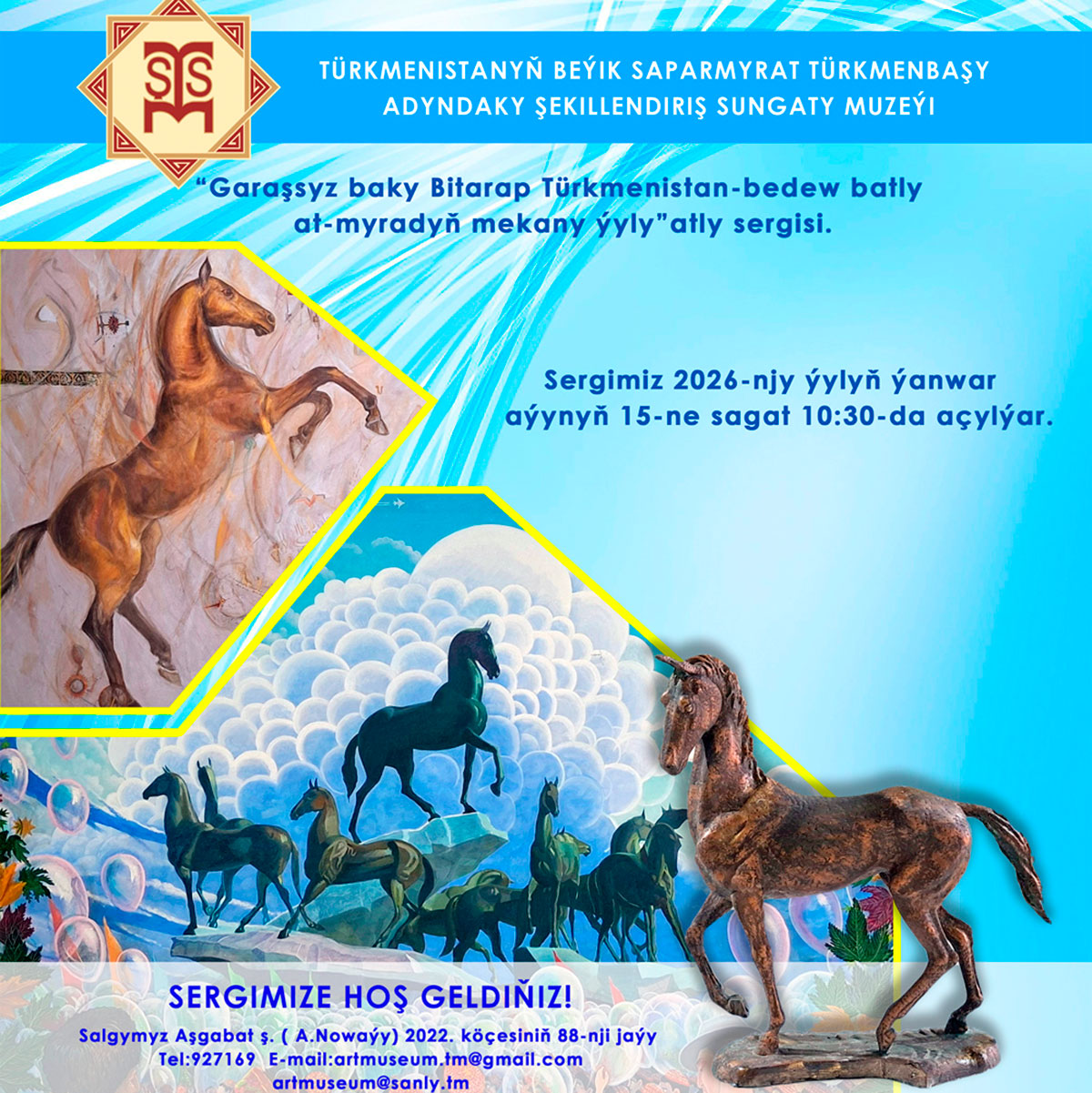 15 января в Государственном музее изобразительных искусств открылась выставка, посвященная девизу года: «Независимый нейтральный Туркменистан – родина целеустремленных крылатых скакунов». В экспозиции представлены произведения искусства, воспевающие ахалтекинских скакунов, снискавших мировую славу.