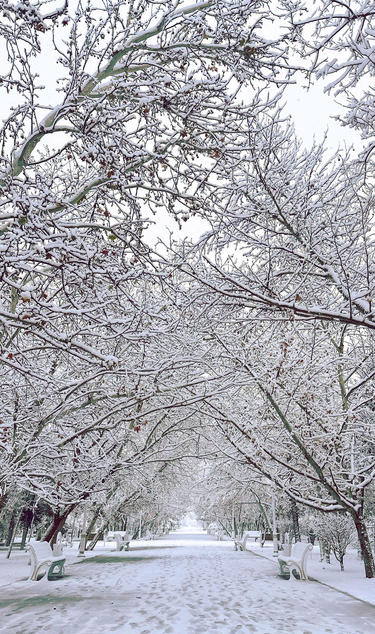 Особенно преобразился парк «XV лет независимости Туркменистана». Снег здесь лег безупречно ровным полотном, превратив аллеи в символ чистоты и обновления.