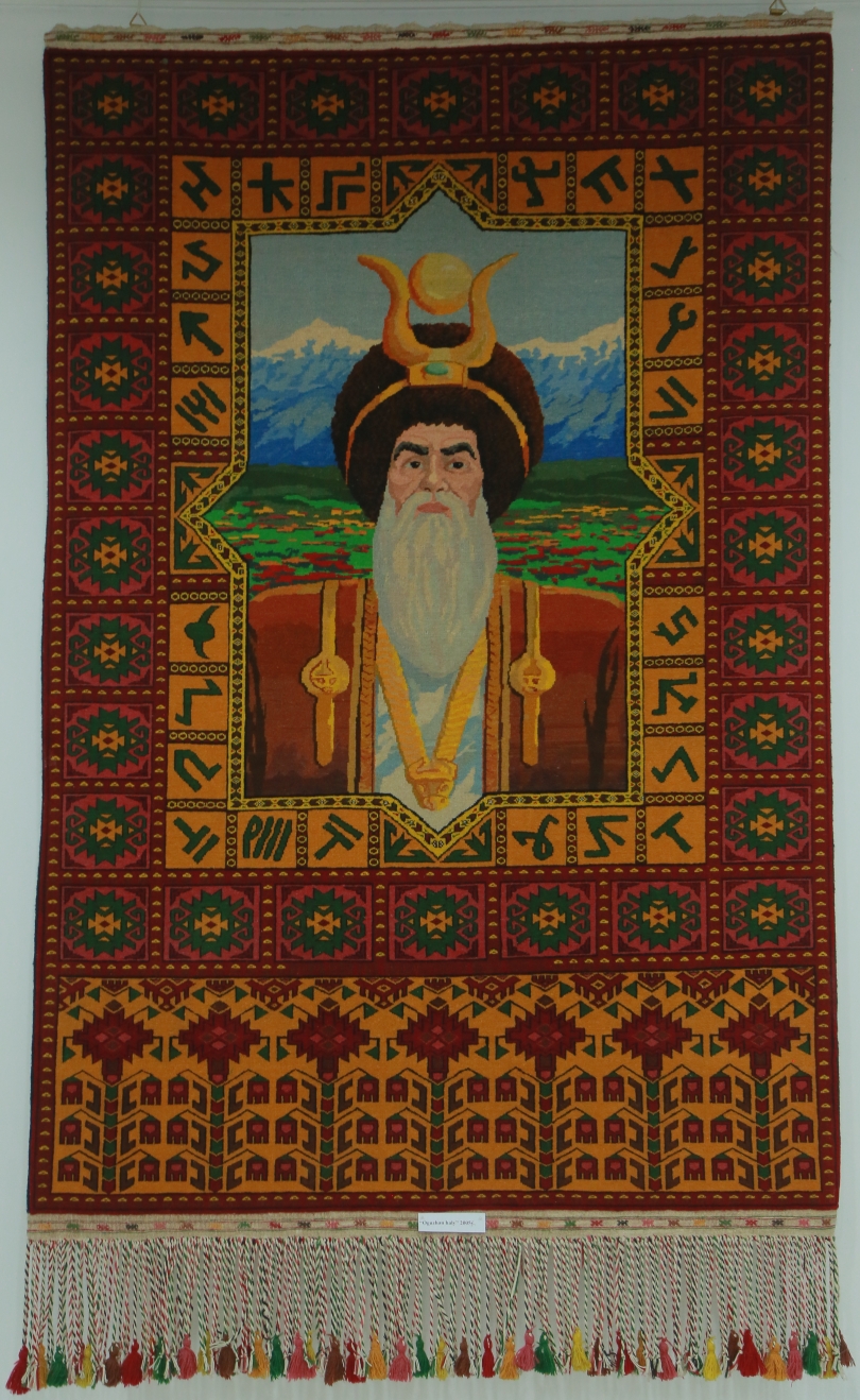 В центре экспозиции торжественно на троне восседал прародитель туркмен Огузхан, вытканный в ковре умелыми руками Шекер. Как оказалось, это – дипломная работа Шекер Худайбереновой к завершению учебы в Государственной академии художеств Туркменистана. Кстати, эта работа попала в Золотой фонд академии. С ковра пронзительным взглядом Огузхан оценивающе взирал на своих потомков.
