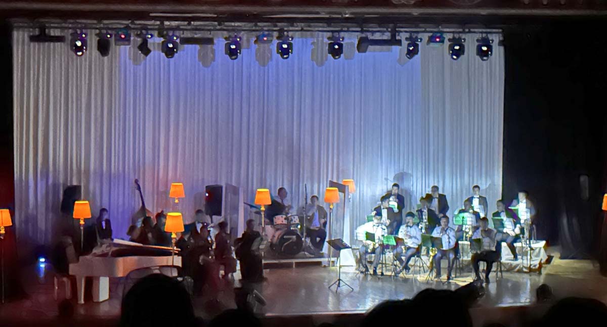 Сцена, оформленная торшерами, замерла в ожидании. На местах для оркестра уже поблёскивала медь духовых инструментов. По центру разместилась внушительная ударная установка Арама Базикяна, а белоснежное фортепиано притаилось, ожидая выхода заслуженного артиста Туркменистана Владимира Мкртумова.