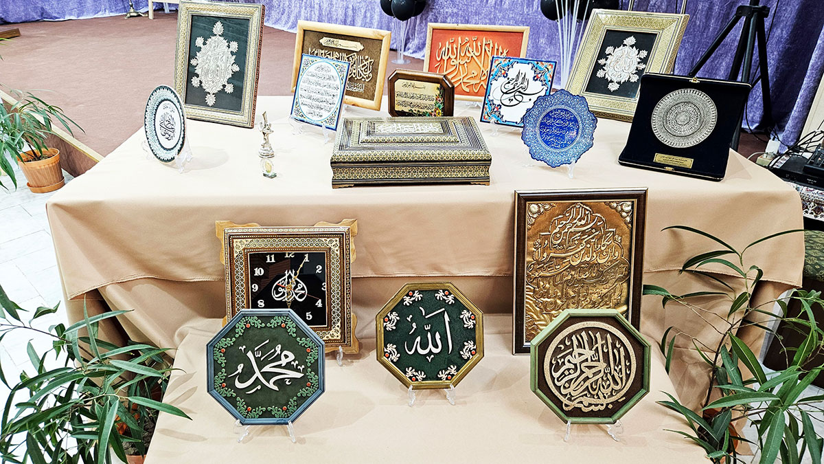 Центральным экспонатом стала уникальная картина с полным текстом Корана, выполненная мельчайшим каллиграфическим шрифтом. Также здесь представлены работы с иллюстрированными кораническими аятами и изречениями персидских поэтов-суфиев в тиснении и позолоте.