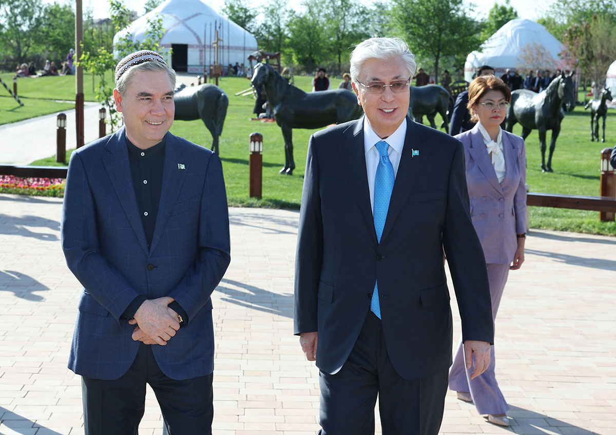 После знакомства с национально-культурным комплексом «Этноаул», Национальный Лидер туркменского народа Герой-Аркадаг и Президент Касым-Жомарт Токаев направились в туристский информационный центр «Turkistan Visit Centre». По пути следования Национальный Лидер туркменского народа и глава дружественного государства сфотографировались на память.