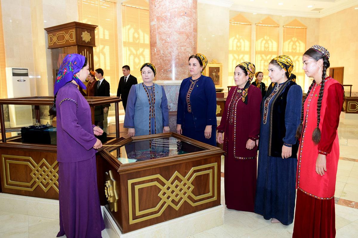В фойе «Türkmeniň ak öýi» развернулась выставка художественного и декоративно-прикладного творчества, а также артефактов из фондов музеев, экспонаты которой рассказывают об идущих из глубины веков самобытных традициях, богатейшем культурном наследии нашего народа, его искусстве. Здесь представлены великолепные ковры, кошмы и гобелены, керамика, скульптурные композиции, старинная национальная одежда, образцы ткани, изящные ювелирные украшения, музыкальные инструменты, предметы традиционного быта туркмен, произведения мастеров кисти и холста, а также издательская продукция.