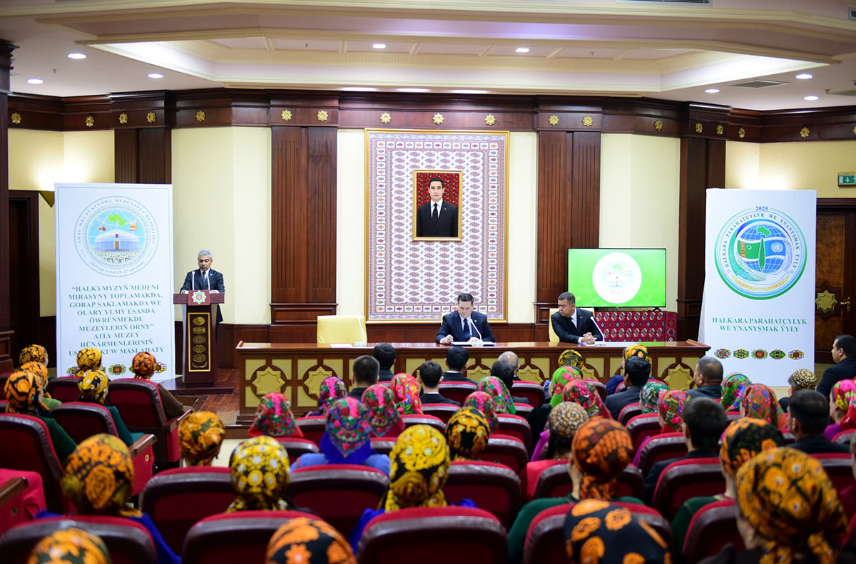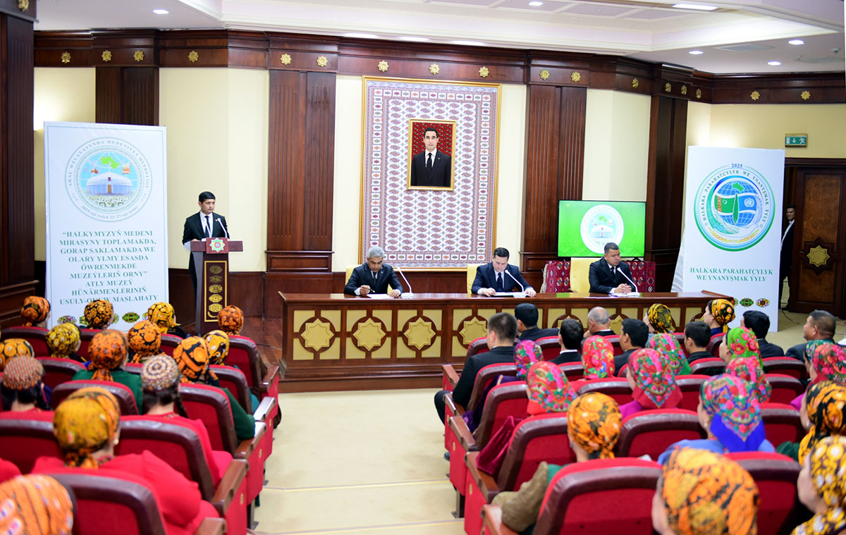 Затем состоялось учебно-методическое совещание специалистов музейного дела на тему «Halkymyzyň medeni mirasyny toplamakda, gorap saklamakda we olary ylmy esasda öwrenmekde muzeýleriň orny», посвящённое роли музеев в сборе, сохранении и научном изучении культурного наследия нашего народа.