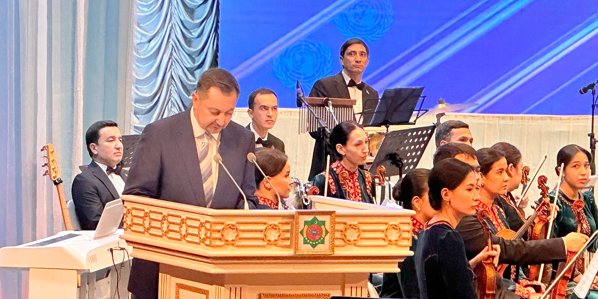 – Biz şu agşam bu ýerde diňe bir sazyň gözelliginden lezzet almak üçin däl-de, eýsem, bizi birleşdirýän baky gymmatlyklar: adam mertebesi, deňlik we raýdaşlyk hakynda oýlanmak üçin hem ýygnandyk. Bu gymmatlyklar Birleşen Milletler Guramasynyň 1945-nji ýylda döredilen gününden bäri ýol görkezijisi bolup, olar biziň şu ýerde, Türkmenistanda we bütin dünýäde alyp barýan işlerimizde ylham bermegini dowam etdirýär.