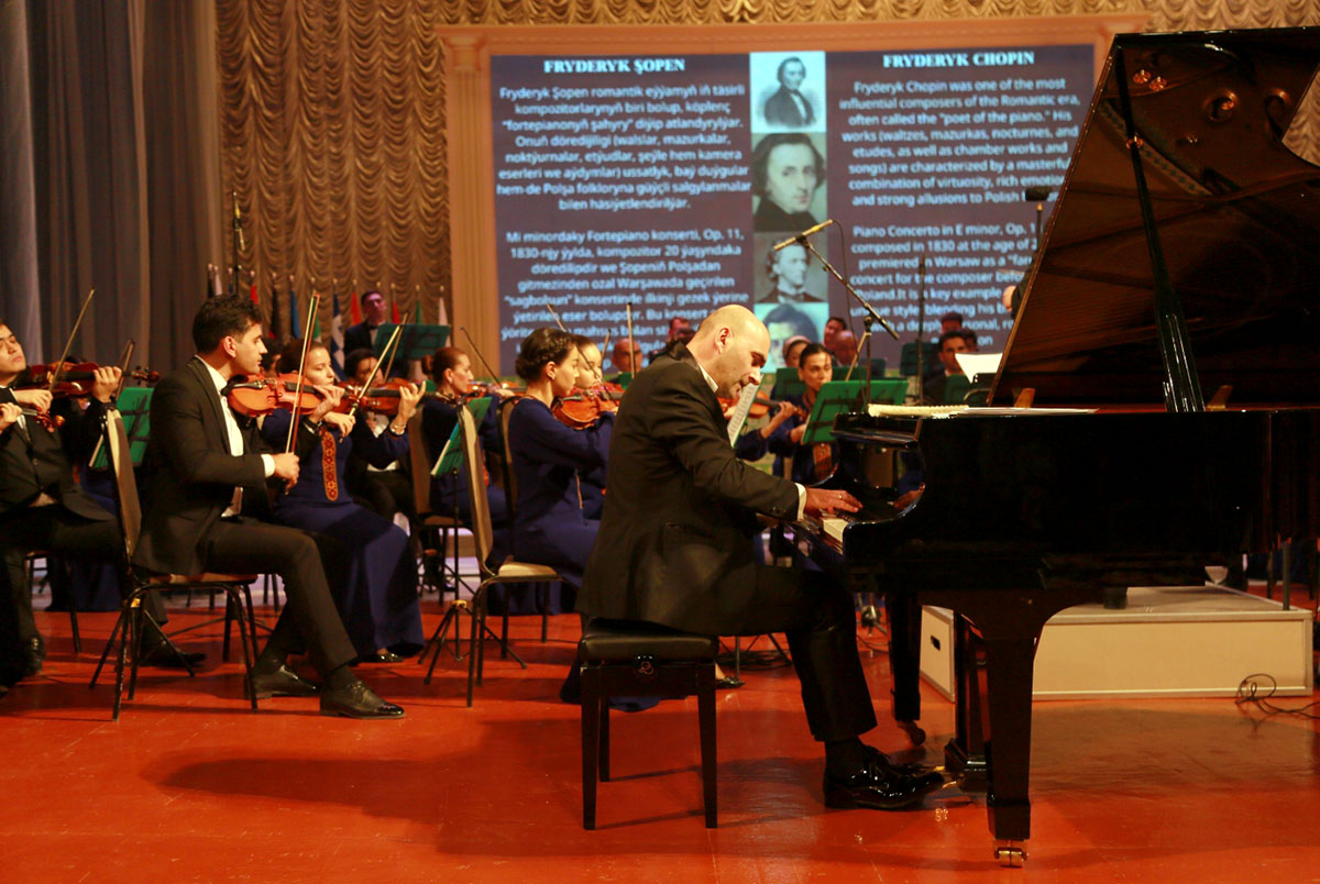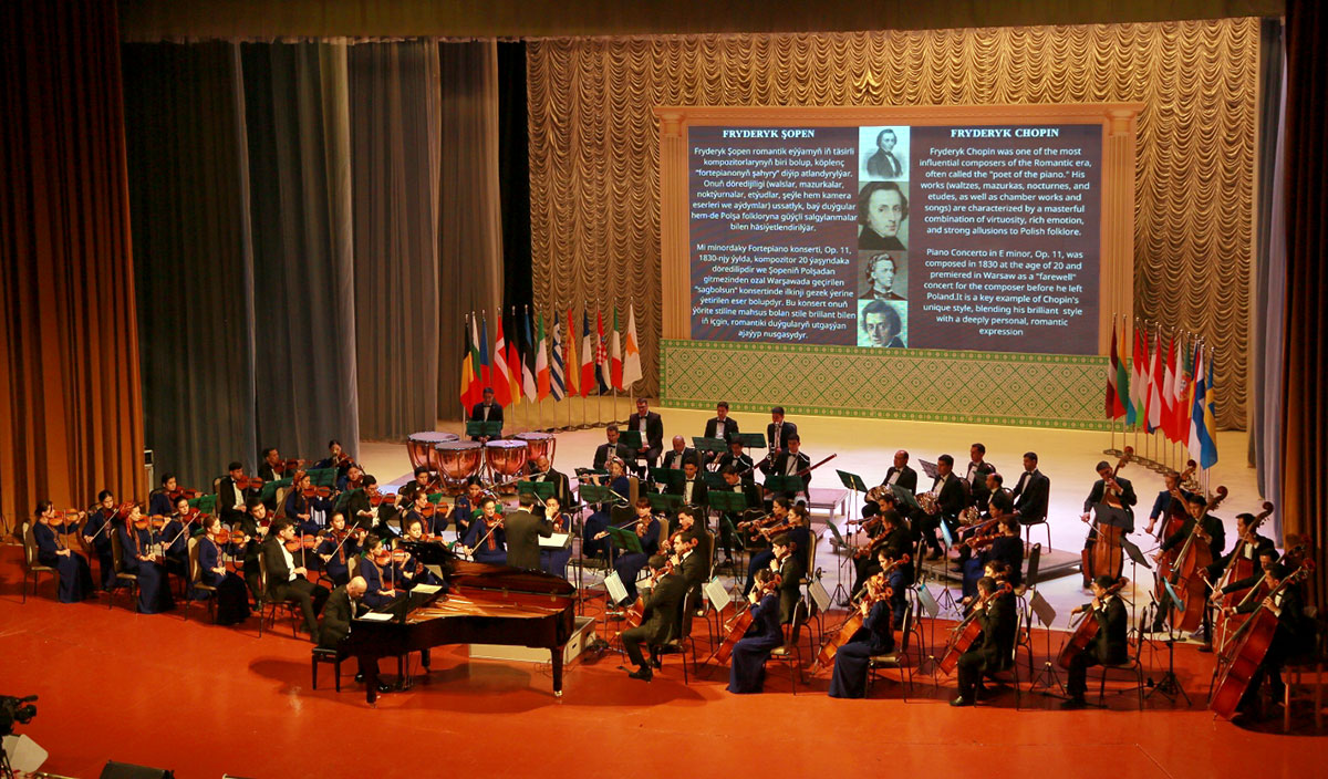 Pianinoçy Frederík Şopeniň 1-nji fortepiano konsertini ýerine ýetiren wagty oňa Türkmenistanyň Döwlet simfoniki orkestriniň sazandalary hem goşuldy, olara Resul Gylyjow ýolbaşçylyk etdi. Şopeniň özüne mahsus bolan näzik, nepis sazy polýak kompozitoryň duýgular dünýäsini beýan edip, zaly täsin duýgylar bilen gurşady. Käbir pursatlarda pianinoçynyň owazy orkestr tarapyndan dowam etdirilip, giň derýa ýaly joşgunly sazy emele getirýärdi.