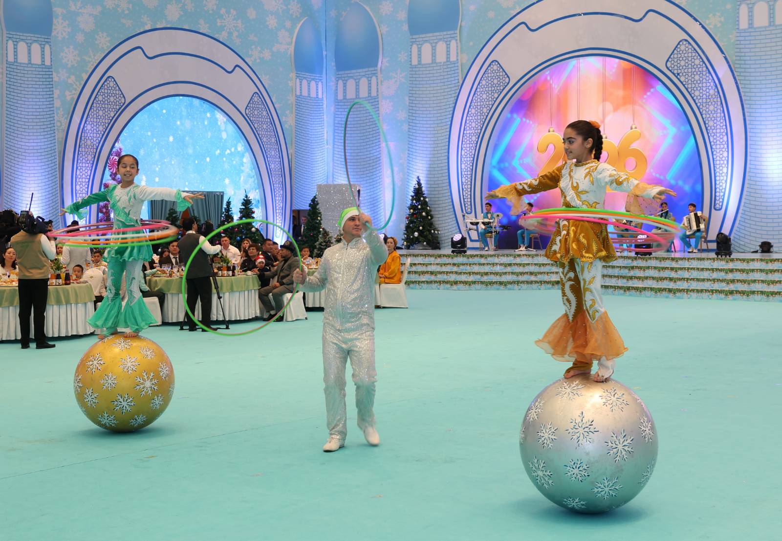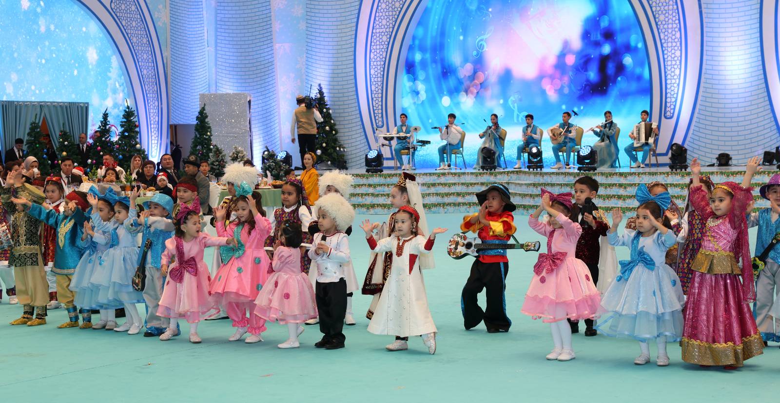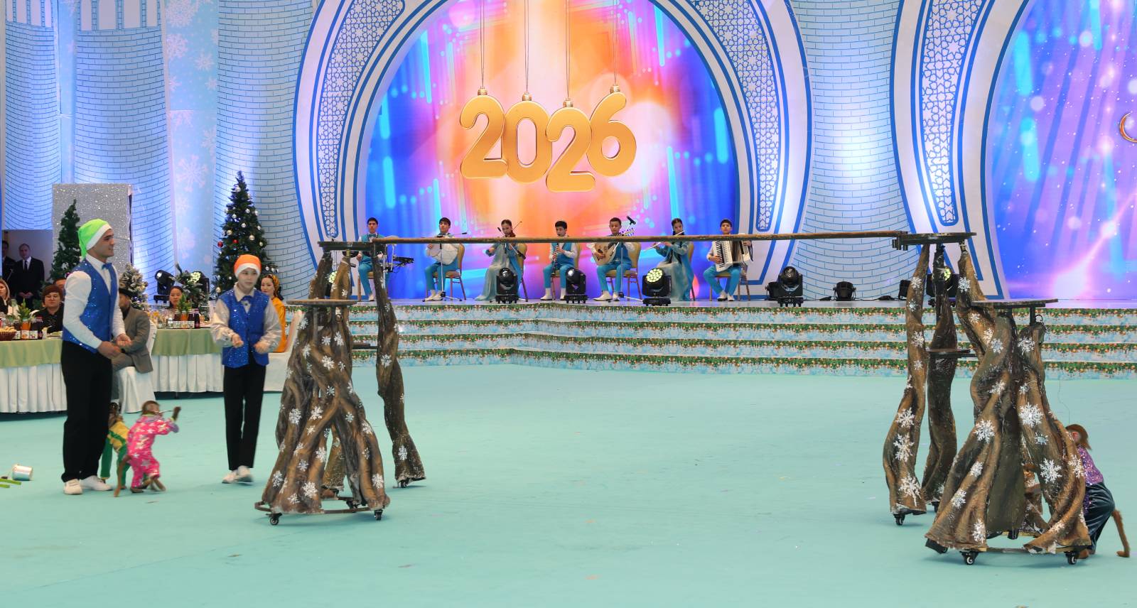 Hormatly Prezidentimiz estrada aýdymçylarynyň, teatr we sirk artistleriniň, folklor-tans toparlarynyň, çagalar döredijilik toparlarynyň, şol sanda çagalar baglarynda terbiýelenýänlerden başlap, dürli ýaşdaky zehinli çagalaryň çykyşlaryna tomaşa etdi. Baýramçylyk äheňinde bezelen sahnada Täze ýyla bagyşlanan ruhubelent aýdym-sazlaryň, joşgunly tanslaryň utgaşmagynda täsirli pursatlara beslenen çykyşlar ýaýbaňlandyryldy. Çagalaryň baýramçylyk mynasybetli dürli dillerde ýerine ýetiren goşgulary dabara gatnaşyjylarda ýakymly täsirleri galdyrdy.
