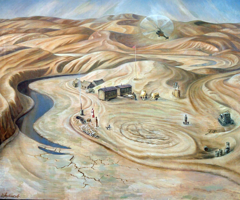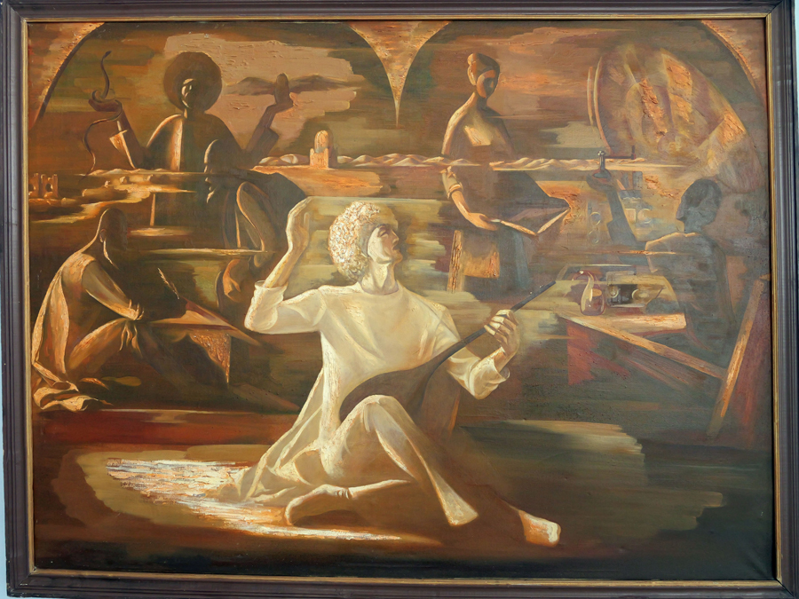 Däp bolşy ýaly, bu muzeýdäki bu baýramçylyga bagyşlanan her sergi Yzzat Gylyjowyň «Fizikler» suraty bilen açylýar. Oňa naýbaşy žiwopis eseri diýse bolar. Türkmenistanyň halk suratkeşi alymlar toparyny göz öňüne getirişi ýaly suratlandyrypdyr. Suratda gündelik durmuşyň aladalaryndan üzňe, durky bilen ylmy gözleglere berlen adamlaryň aýratyn bir topary şekillendirilipdir. Nakgaş olary döwrebaplykdan birnäçe ädim öňde ýaly suratlandyrýar. Bu alymlaryň özüni alyp barşynda, durşunda we hatda geýinişlerinde-de duýulýar.
