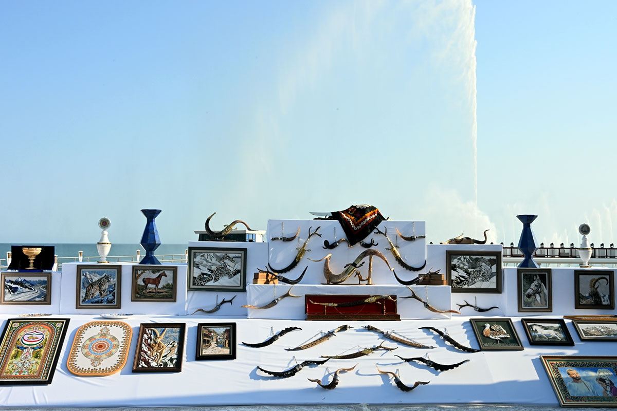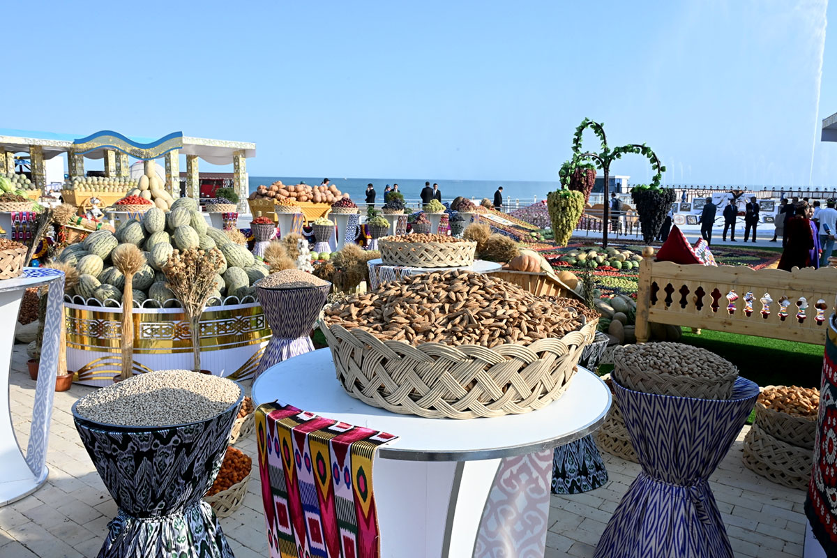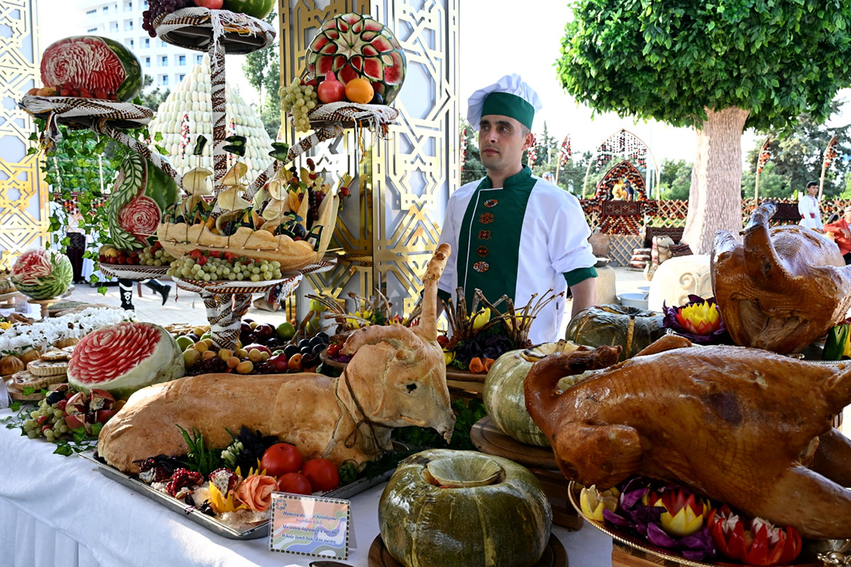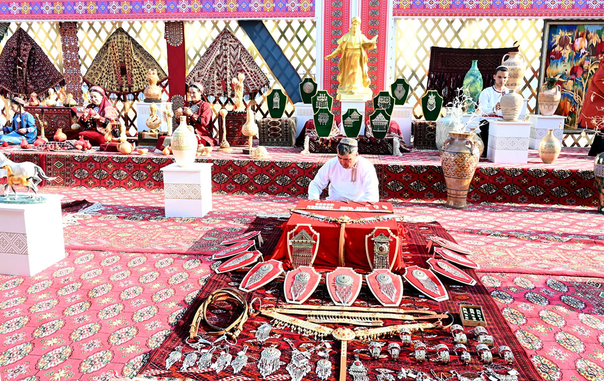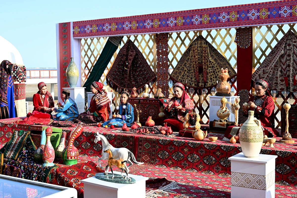 Gahryman Arkadagymyz hem-de wekiliýet ýolbaşçylary soňra Türkmenistanyň sergi meýdançasyna geldiler. Bu ýerde myhmanlar ýurdumyzyň medeniýet we sungat ussatlarynyň ýerine ýetiren çykyşlaryna tomaşa etdiler hem-de Milli Liderimiziň tagallalary bilen çap edilen “Bereketli türkmen saçagy” atly kitabyň esasynda milli tagamlaryň taýýarlanylyşyny, gök-bakja hem-de miwe önümleriniň, şeýle hem amaly-haşam sungatynyň eserleriniň sergisini synladylar.