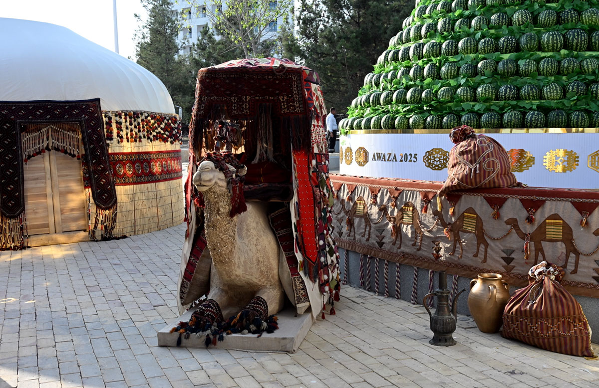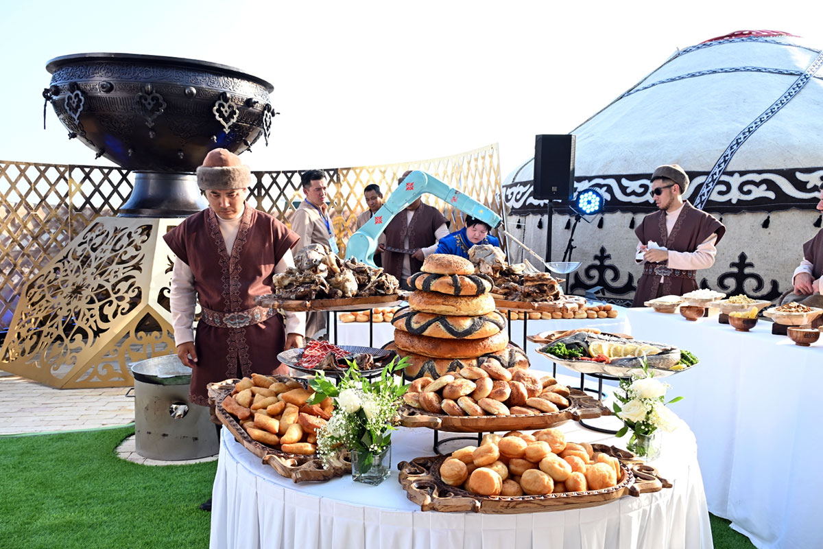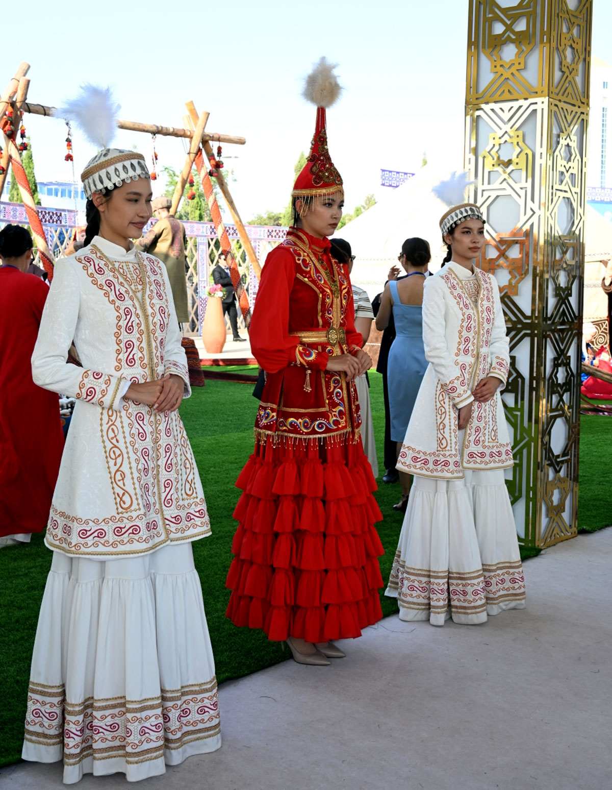 Soňra türkmen halkyna mahsus myhmansöýerlik däplerine eýerilip, Gahryman Arkadagymyz we wekiliýet ýolbaşçylary Türkmenistanyň sergi meýdançasynda dikilen ýörite ak öýe, saçak başyna çagyryldy. Bu ýerde ýokary derejeli myhmanlara türkmen milli tagamlary hödür edildi.