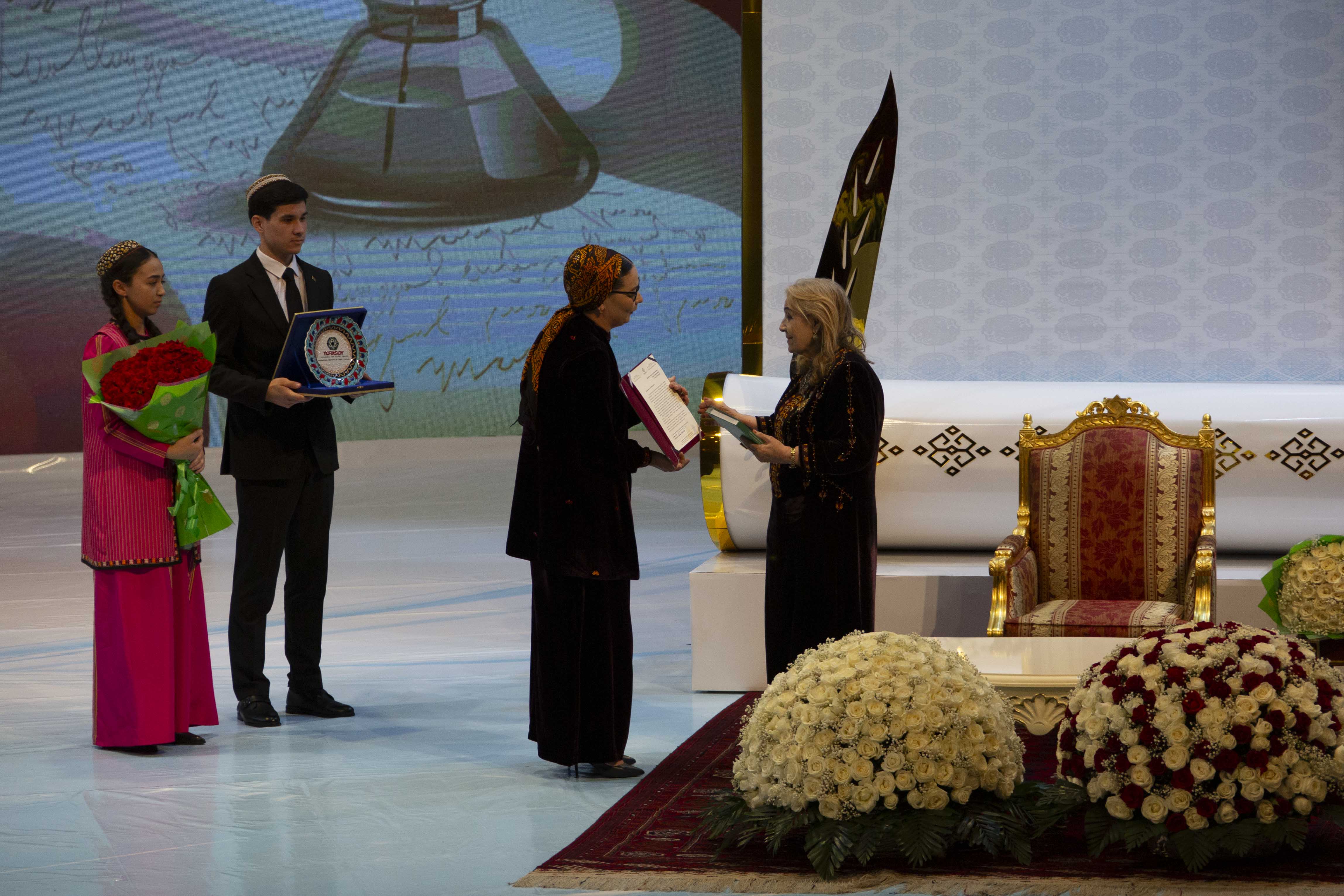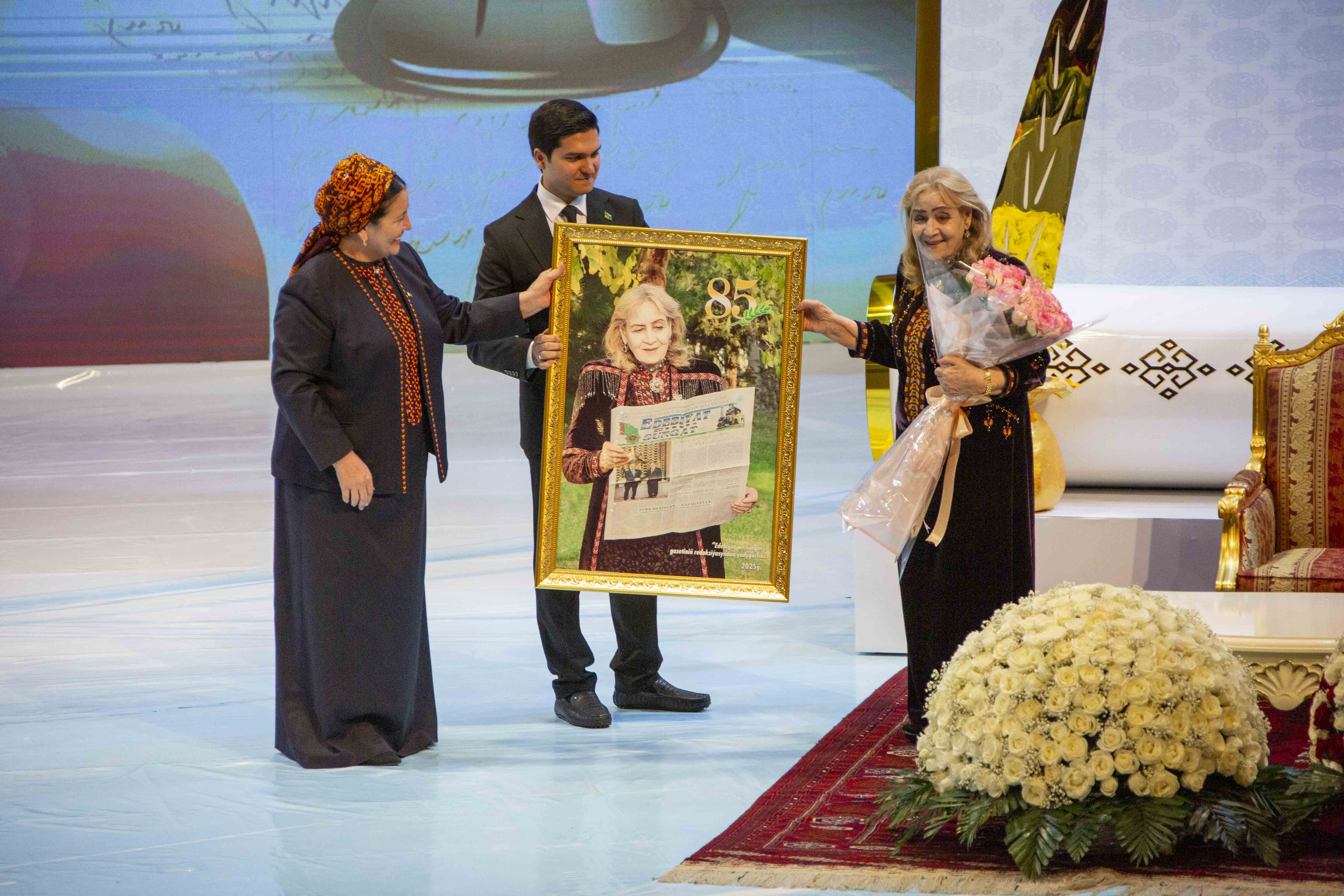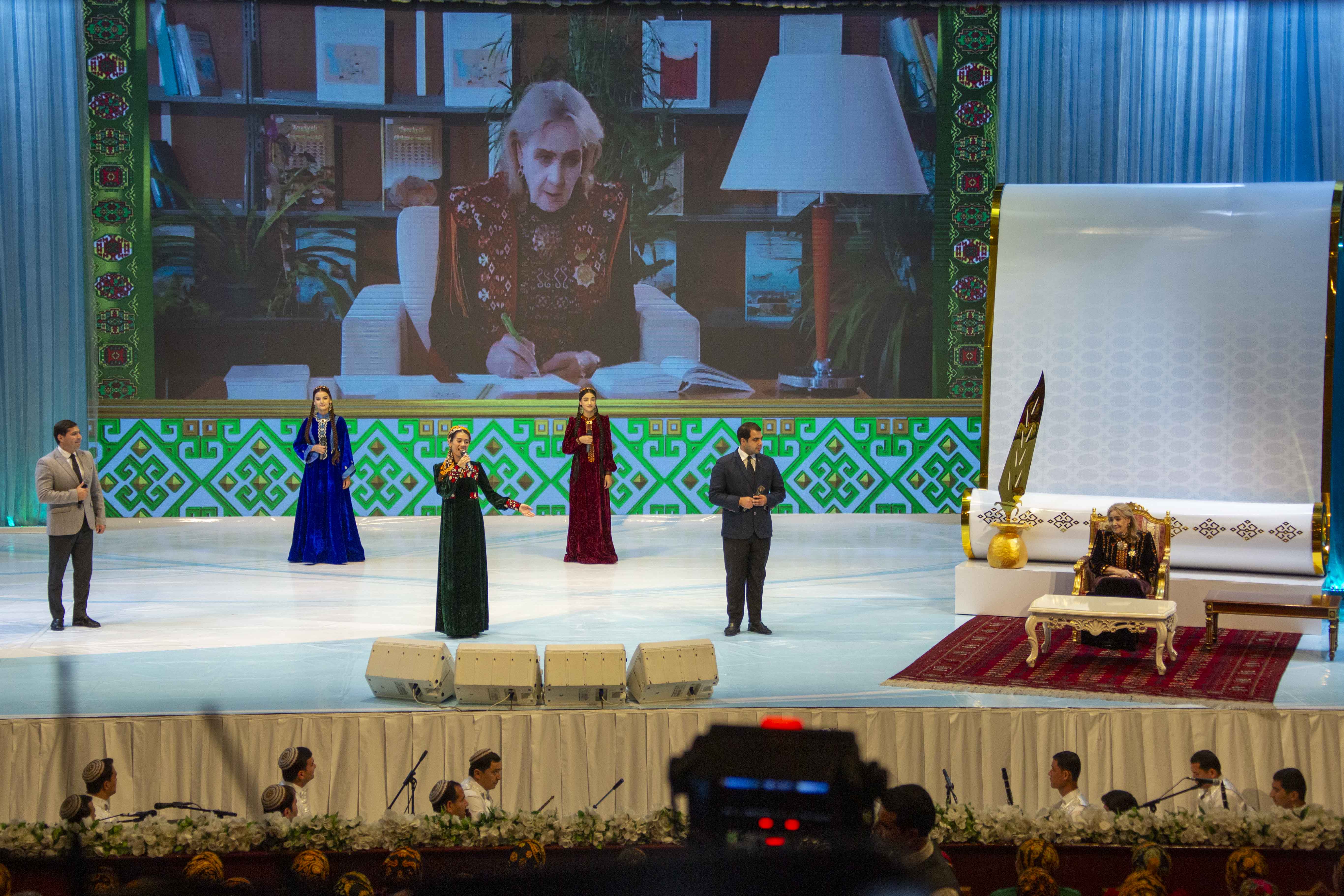 Döwlet Baştutanymyzyň Gutlagyny hem dabara gatnaşyjylar dowamly el çarpyşmalar bilen kabul etdiler. Şol pursatda ussat şahyra hormatly Prezidentimiziň iberen ajaýyp ter çemeni gowşuryldy.
