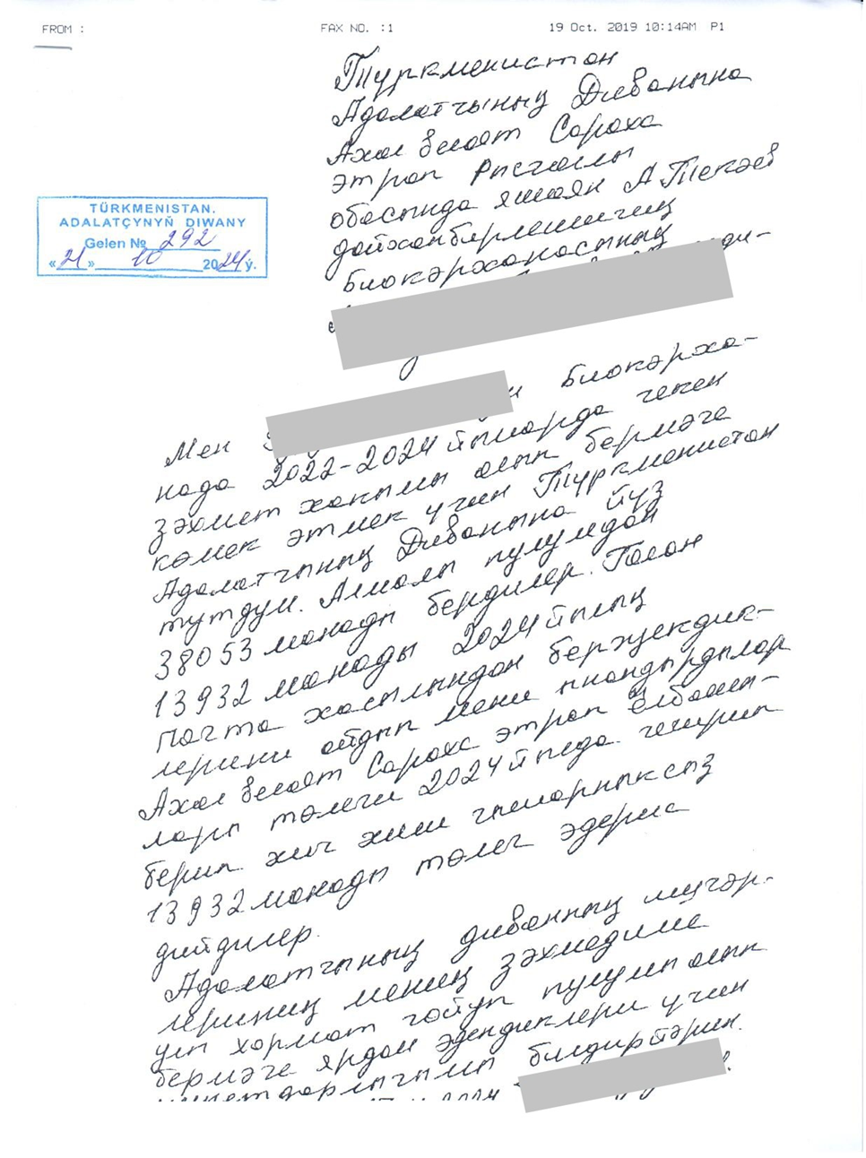 Ahal welaýatynyň ýaşaýjysy Ş.G. 2022-2024-nji ýyllardaky zähmet hakynyň doly tölenmeýänligine nägilelik bildirip, bu meselede ýardam berilmegini sorap ýazan arzasy Adalatçynyň Diwanynda hasaba alnyp, «Adalatçy hakynda» Türkmenistanyň Kanunynyň 18-nјi maddasynyň 1-nji böleginiň 2-nji bendine laýyklykda Ş.G.-nyň işleýän edarasyndan degişli resminamalar alynyp barlanylanda,onuň 2022-2024-nji ýyllardaky zähmet hakynyň doly tölenilmändigi anyklandy. Netijede Adalatçynyň ýüztutmasyna Ahal welaýat häkimligi tarapyndan seredilip Ş.G.-nyň şahsy plastik kartyna degişli töleg tabşyrygy esasynda 18028 we 38053 manat möçberdäki zähmet hakynyň geçirilendigi, galan 13932 manadyň bolsa, 2024-nji ýylyň pagta hasylyndan alynjak girdejiden töleniljekdigi barada habar berildi.