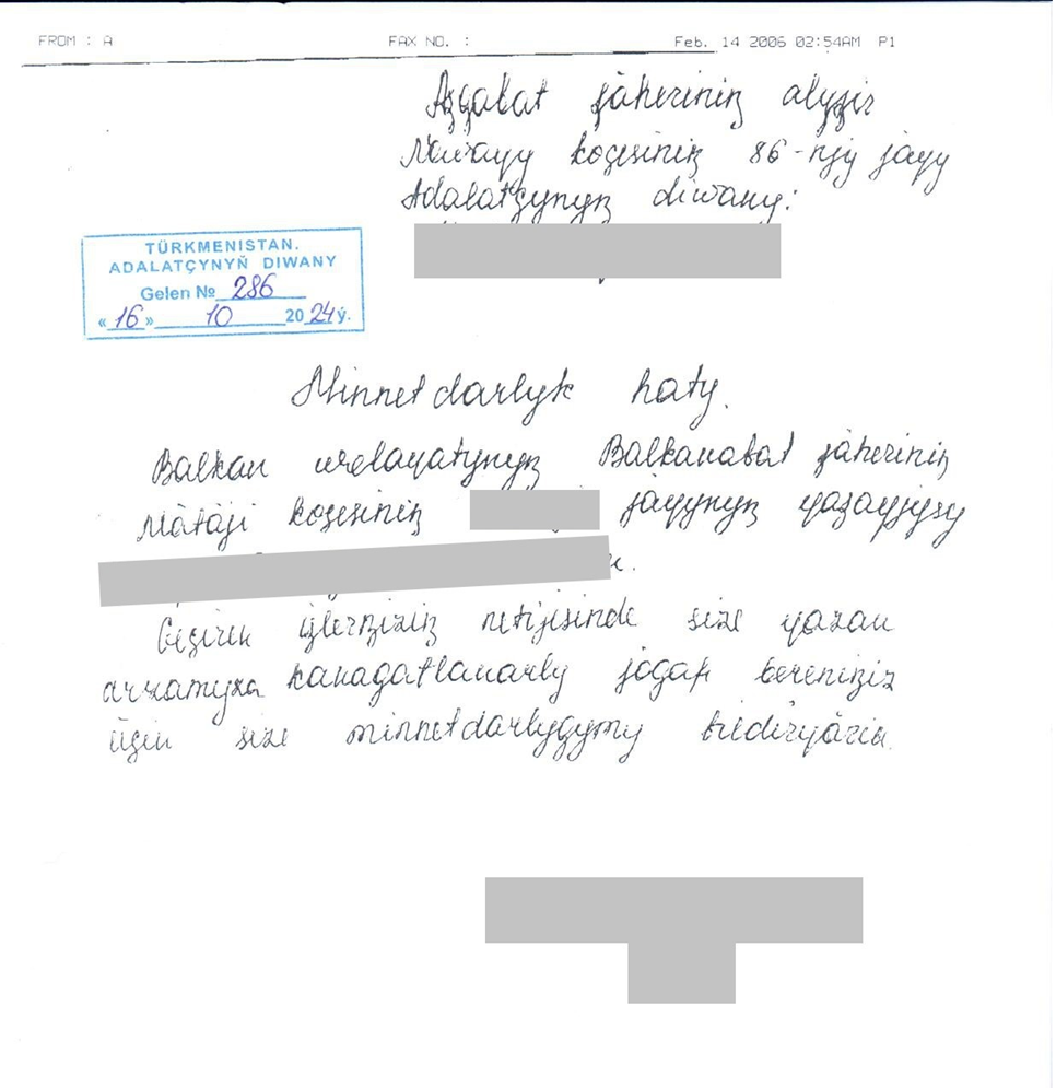 Lebap welaýatynyň ýaşaýjysy G.T. öz raýat işi boýunça çykarylan kazyýet kararlaryndan nägile bolup, bozulan hukuklarynyň dikeldilmegine ýardam bermekligi sorap ýazan arzasy Adalatçynyň Diwanynda hasaba alnyp, «Adalatçy hakynda» Türkmenistanyň Kanunynyň 18-nјi maddasynyň 1-nji böleginiň 2-nji bendine laýyklykda arzada soralýan mesele degişli resminamalar alnyp öwrenildi. Netije-de Adalatçynyň ýüztutmasy boýunça G.T.-nyň Türkmenistanyň Yokary kazyýetine gözegçilik tertibinde beren şikaýaty Türkmenistanyň Yokary kazyýetiniň raýat işleri boýunça kazyýet kollegiýasynyň 2024-nji ýylyň 25-nji aprelindäki mejlisinde seredilip, Lebap welaýatynyň Saýat etrap kazyýetiniň 2023-nji ýylyň 7-nji dekabryndaky çözgüdi we Lebap welaýat kazyýetiniň raýat işleri boýunça kazyýet kollegiýasynyň 2024-nji ýylyň 7-nji fewralyndaky kesgitnamasy sökülip, işi täzeden kazyýet mejlisinde, kazyýetiň başga düzüminde seretmek üçin Lebap welaýatynyň Tiirkmenabat şäher kazyýetine iberilendigi barada habar berildi.