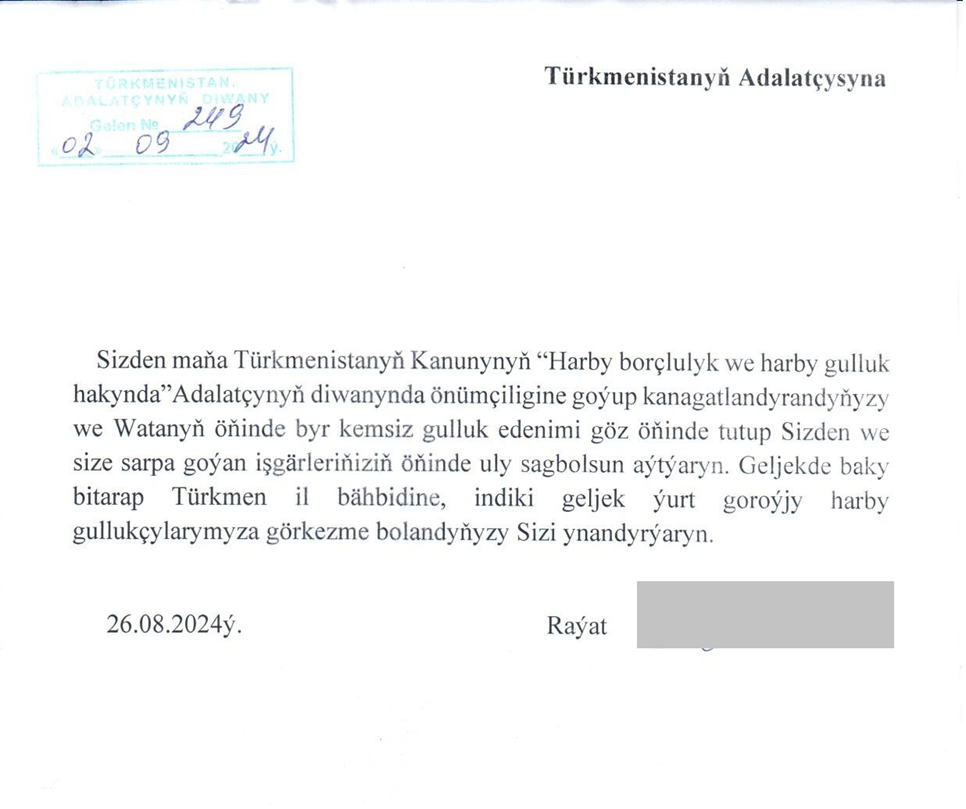 Daşoguz welaýatynyň ýaşaýjysy I.I. çagyryş boýunça harby gullugy geçýän döwri gözüniň görüjiligine zyýan ýeten ogly M.I. saglygynyň dikeldilmegine ýardam berilmegini sorap ýazan arzasy Adalatçynyň Diwanynda hasaba alnyp, «Adalatçy hakynda» Türkmenistanyň Kanunynyň 27-nji maddasy esasynda Adalatçynyň ýüztutmasy boýunça Türkmenistanyň Goranmak ministrligine iberildi. Arza seredilmegi netijesinde, Türkmenistanyň Goranmak we Türkmenistanyň Saglygy goraýyş we derman senagaty ministrlikleriniň 2017-nji ýylyň 21-nji noýabryndaky 277/381 belgili bilelikdäki buýrugy bilen tassyklanan «Türkmenistanyň Yaragly güýçlerinde luykmançylyk güwä geçmesi hakynda» Düzgünnama laýyklykda 2024-nji ýylyň 16-njy noýabrynda Merkezi harby lukmançylyk toparynyň çözgüdi bilen M.I. gözüne goýlan kesel kesgidi esasynda harby gullukdan möhletindeň öň boşadylyp, gözüni gaýtadan lukmançylyk barlagyndan geçirmek üçin goşmaça 40000 manat möçberinde kömek pulunyň berlendigi barada habar berildi.