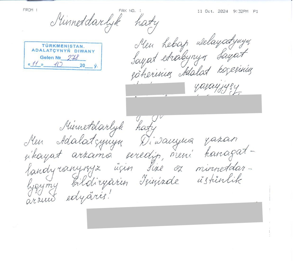 Daşoguz welaýatynyň ýaşaýjysy Z.M. zorlukly hereketleriň netijesinde gyzy G.R. öz janyna kast edip ölendigi baradaky waka boýunca O.S. jenaýat jogapkärçiligine çekilmändigine nägilelik bildirip, bu meselede ýardam berilmegini sorap ýazan arzasy Adalatçynyň Diwanynda hasaba alnyp, «Adalatçy hakynda» Türkmenistanyň Kanunynyň 27-nji maddasy esasynda Adalatçynyň ýüztutmasy Türkmenistanyň Baş prokuraturasyna iberildi. Geçirilen barlagyň netijesinde, 2003-nji ýylda doglan G.R. öz öýlerinde özüni asyp aradan çykandygy baradaky habar boýunça Akdepe etrabynyň prokuraturasy tarapyndan Türkmenistanyň Jenaýat iş ýörediş kodeksiniň 214-nji we 215-nji maddalaryna laýyklykda barlag işleriniň geçirilendigi we 2024-nji ýylyň 28-nji noýabrynda O.S.-yň garşysyna Türkmenistanyň Jenaýat kodeksiniň 106-njy maddasynyň 2-nji bölegi (öz-özüni öldürmäge mejbur etmek) bilen jenaýat işi gozgalyp, aýyp bildirlip, tussag astyna alynyp, deslapky derňew işleriniň alynyp barylýandygy barada habar berildi.