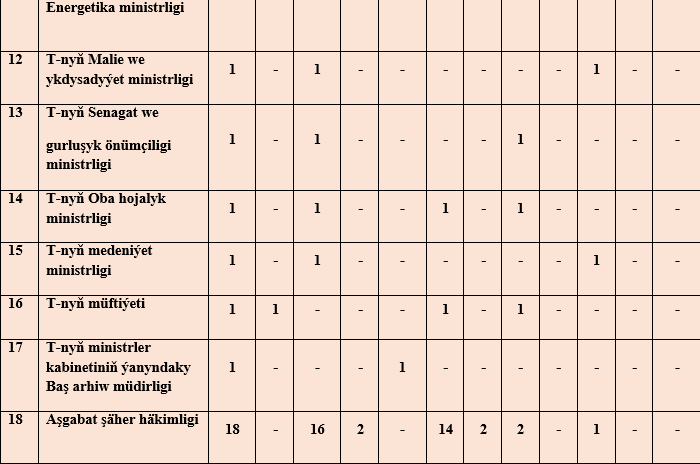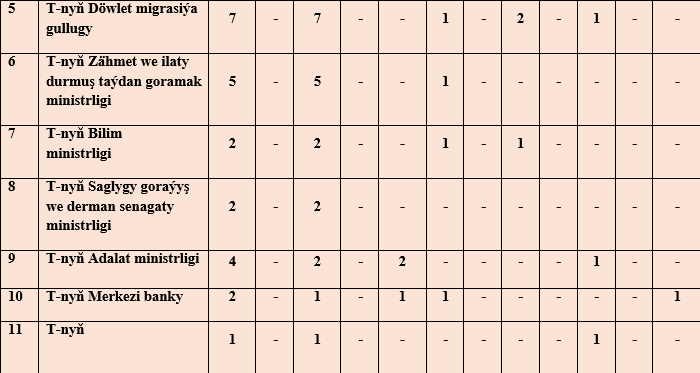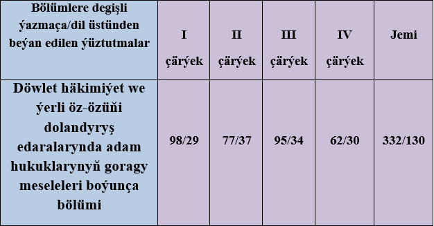 Döwlet häkimiýet we ýerli öz-özüňi dolandyryş edaralarynyň şonuň bilen birlikde eýeçiligiň görnüşine garamazdan kärhanalaryň, edaralaryň we guramalaryň adam hukuklaryna we azatlyklaryna täsir edýän namalarynyň öwrenilmegi, şeýle hem, bu mesele boýunça Adalatçynyň Diwanyna gelip gowuşýan ýüztutmalary, ýurdymyzda adam hukuklarynyň we azatlyklarynyň üpjün edilişine we berjaý edilişine baha bermäge we öwrenmäge mümkinçilik döretdi.Maglumat ýylynda Adalatçynyň Diwanyna gelip gowşan her bir dilden we ýazmaça ýüztutmalar, «Adalatçy hakynda» Türkmenistanyň Kanunyna laýyklykda seredilip, degişli netijeler çykaryldy.