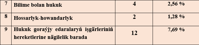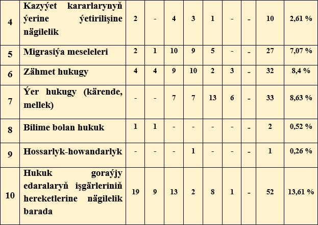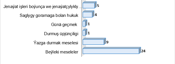 Şeýle-de, Adalatçynyň Diwanyna ýazylan ýüztutmalaryň käbirlerinde raýatlaryň hukuklarynyň ýönekeýje jedelsiz meselelerde hem ýerine ýetirilmeýänligine gabat gelinýär. Ýagny, döwlet edaralaryndan gerekli resminamalary almakda bökdençlik çekýändikleri, döwlet edaralaryna ýazan arzadyr-şikaýatlaryna jogap berilmän galdyrylýan halatlaryň bolýandygy anyklandy. Adalatçynyň şeýle ýüztutmalar boýunça geçiren işleriniň netijesinde hem raýatlaryň ýüztutmalarda gozgan meseleleriniň oňyn çözülenleri boldy.