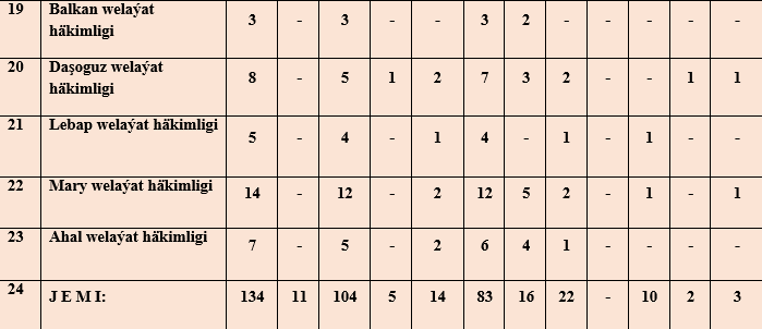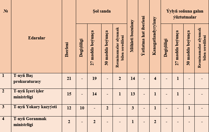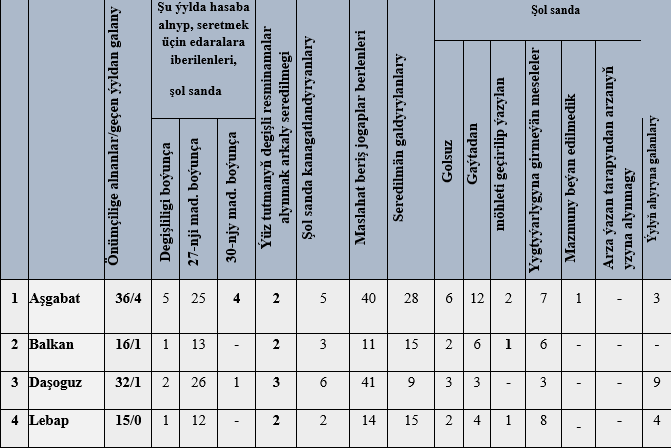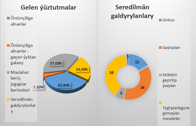 Maglumatda raýatlaryň ýüztutmalaryna seretmegiň netijeleri, geçirilen barlaglarda ýüze çykarylan kanun bozulmalar we olar boýunça raýatlaryň hukuklarynyň dikeldilen, jogapkär wezipeli adamlar babatda görilen çäreler beýan edildi. Alnyp barylan işleriň netijesinde ministrliklere, pudaklaýyn dolandyryş edaralaryna, ýerine ýetiriji häkimiýetiň ýerli edaralaryna «Adalatçy hakynda» Türkmenistanyň Kanunynyň 27-nјi maddasyna esaslanyp iberen ýüztutmalary we 30-nјy maddasyna esaslanyp beren teklipleri görkezildi.
