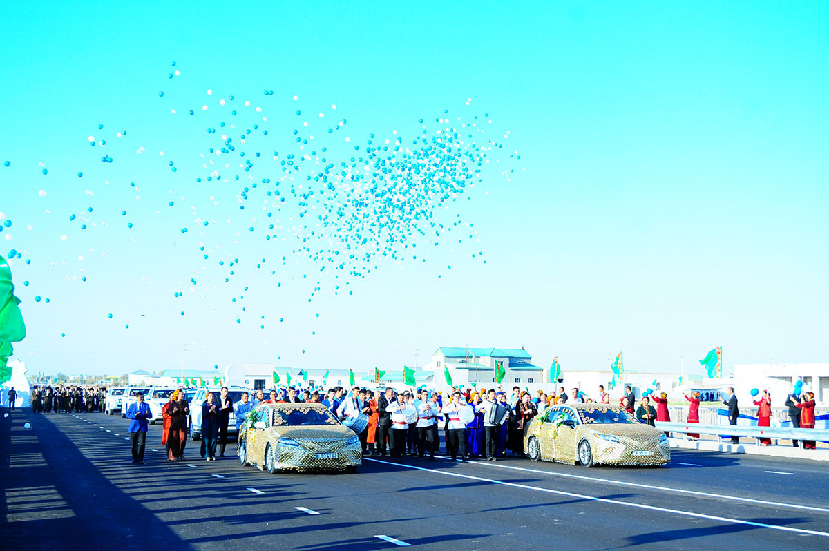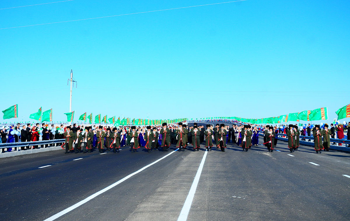 Dabara gatnaşyjylaryň şowhunly el çarpyşmalary bilen täze köprülerden ilkinji awtoulaglar geçip başlaýar. Döwrebap ýol-ulag desgalary awtoulaglaryň iki tarapa hem bökdençsiz hereket etmegini üpjün edýär. Köprüleriň ugrunda germewler, yşyklandyryş ulgamlary çekilipdir.