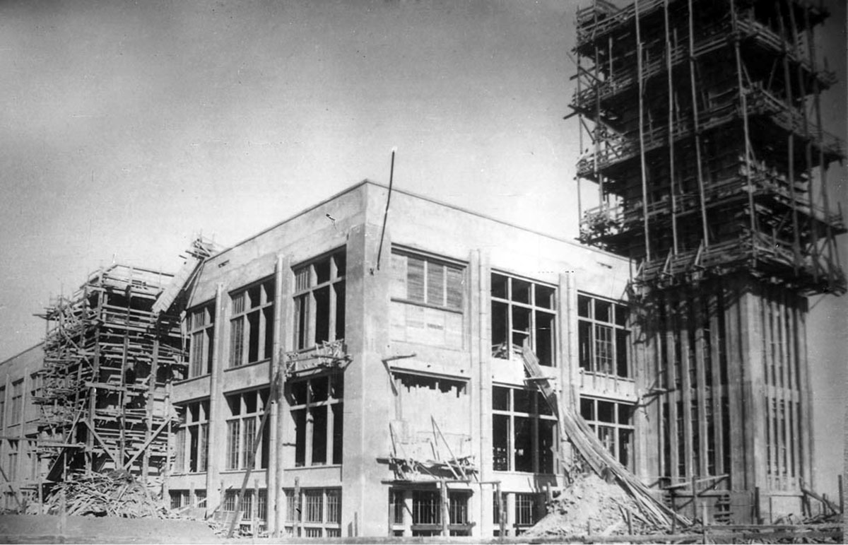 Aşgabatdaky bu ilkinji dokma fabrigi Moskwanyň, Leningradyň we beýleki senagat merkezleriniň alymlarydyr inžener-tehniki işgärleri tarapyndan taýýarlanan taslama laýyklykda guruldy. Taslama işlerine iki professor W.M.Keldyş we W.M.Çaplin ýolbaşçylyk edýärdi. Fabrigiň binasyny guran «Tekstilstroý» gurluşyk edarasynyň ýolbaşçysy bolsa inžener L.G.Porohindi. Hut şu adamlaryň zähmeti netijesinde 1948-nji ýylyň 6-njy oktýabrynda bolup geçen betbagtçylykly ýer titremesinde egirme-dokma fabrigi diňe bir abat galman, eýsem 300 adamyň – gijeki nobatdaky işçileriň janyny hem halas etdi. Esasy binanyň hemmä tanyş sagatly diňi bolsa elhenç betbagtçylykda ýykylman galan ýeke-täk binadyr.