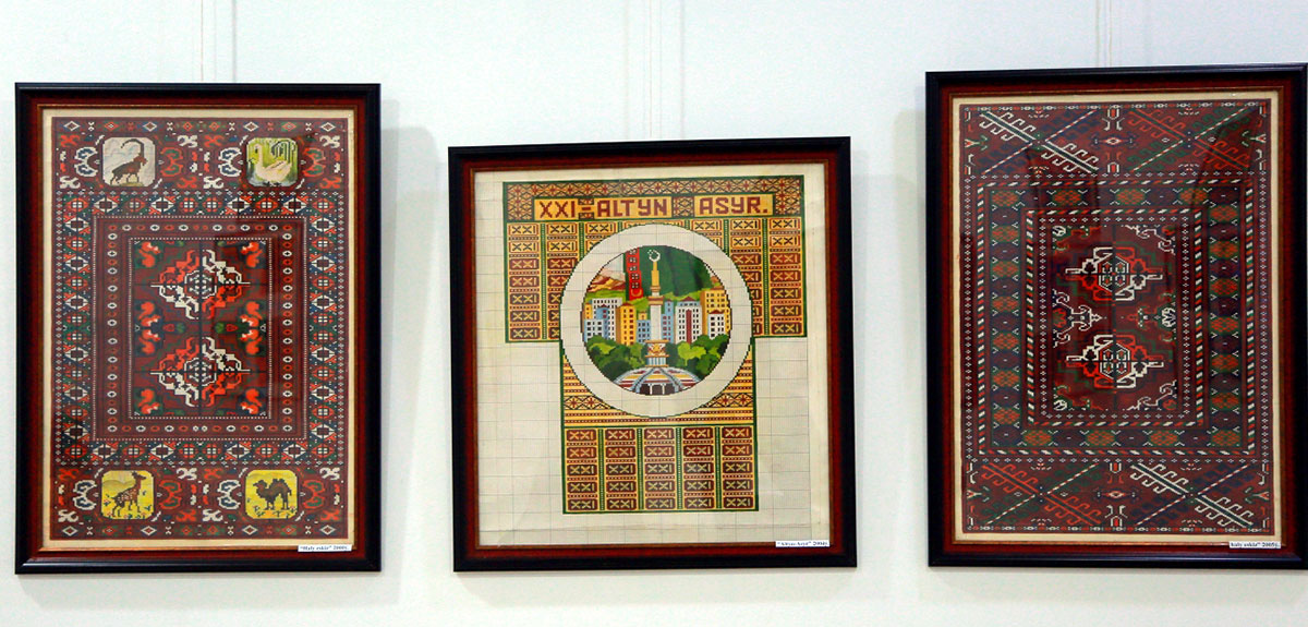 The anniversary exhibition of Sheker Hudayberenova’s works clearly demonstrated the artist’s ability to transform everything she sees into her own carpet ornaments and to skillfully vary color palettes. Sheker Shayarovna presented numerous sketches from which carpets and tapestries have already been woven, as well as designs patiently awaiting their time. Among the sketches, the work “XXI – Altyn Asyr” stands out. Sheker depicted the Monument of Independence of Turkmenistan within a circle, and for the background chose the Roman numeral XXI, placing it in a rectangle and arranging multiple such rectangles into a creative ornament.