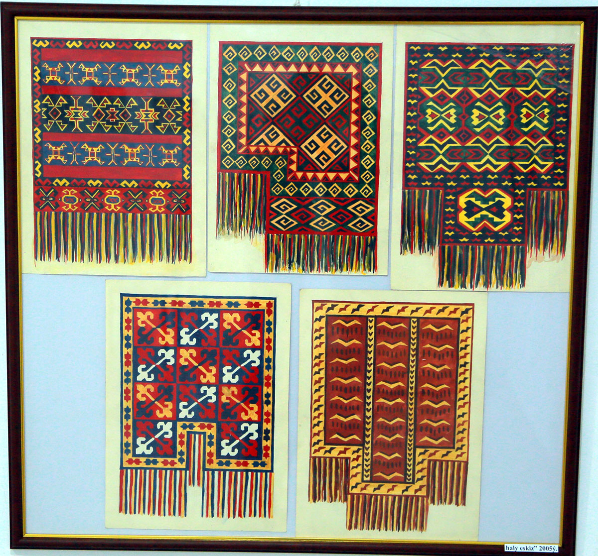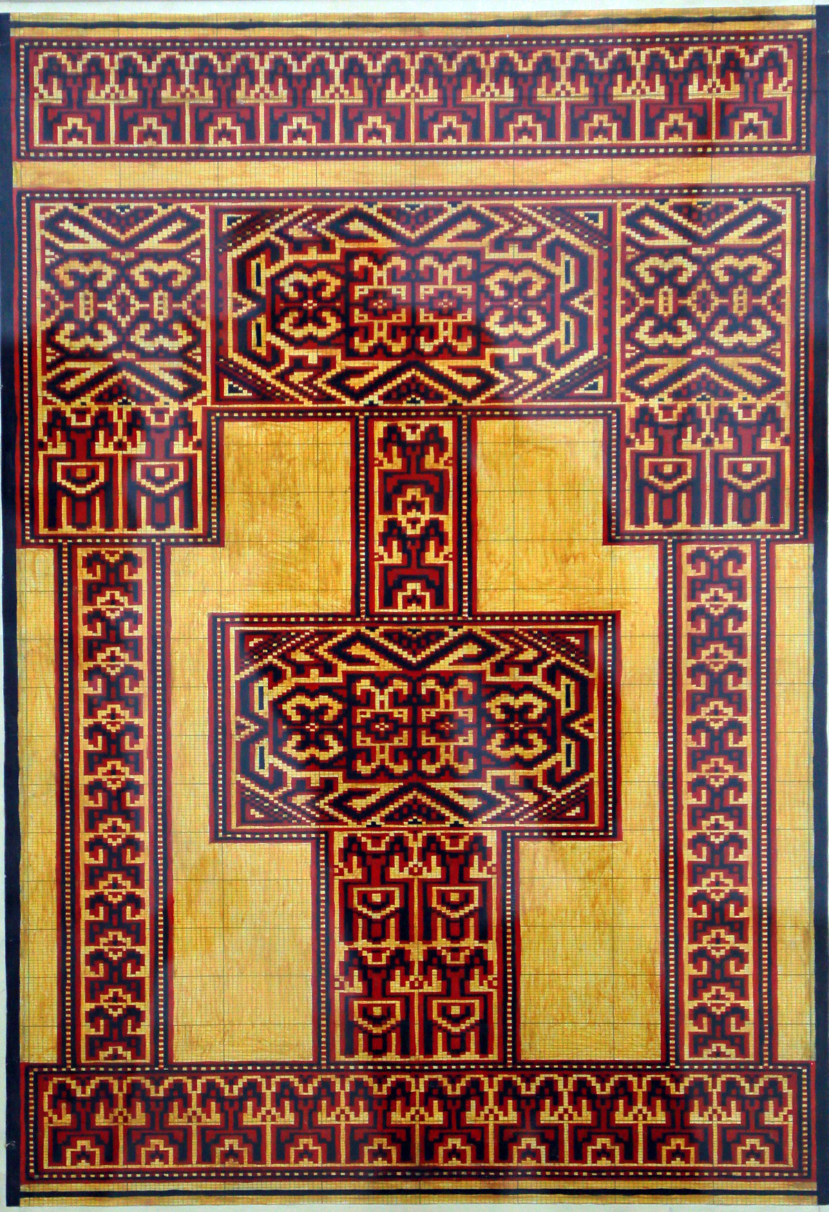 Among the carpet pieces, special attention was drawn to a carpet featuring in its center a stylized structure resembling a mosque, as well as a kejebe — a wedding carriage — or even a piece of jewelry. Each viewer is given the right to determine the purpose of this structure according to their own interpretation.