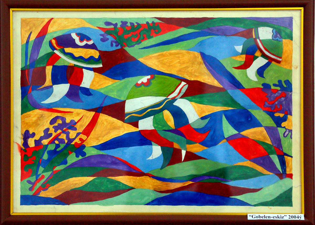 Sheker is a native of the Halach etrap of the Lebap velayat. From her childhood memories, her mother wove carpets in her spare time, while her father, an accountant by profession, loved drawing literary characters. Sheker was more inclined toward her father’s passion. At school, she was responsible for the wall newspaper, and teachers turned only to her for all design work. However, when the time came to choose a specialty upon entering the Turkmen State Art School, Sheker selected the carpet department. Her teacher, Anna Yomudovna Atayeva, could not have been prouder of her student, who, in addition to her studies, regularly visited the Ashgabat Carpet Factory. The teacher advised the diligent student to continue her education at the Academy of Arts, and Sheker followed her advice. At the Academy, her instructor Amanmyrat Atayev immediately noticed in the first-year student a unique ability not to repeat traditional carpet ornaments but to create new ones. He created all the necessary conditions to develop these abilities.